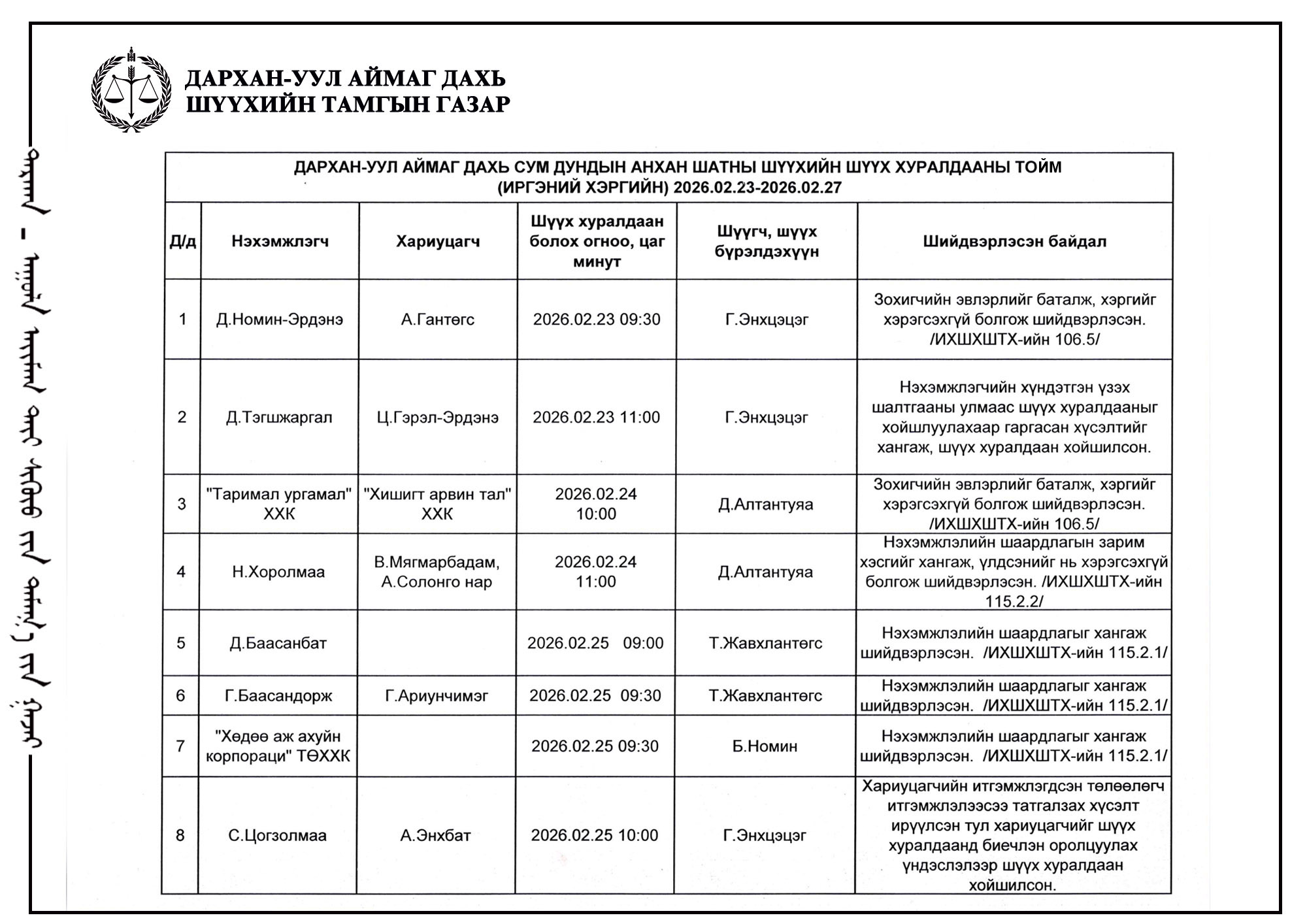 ШҮҮХ ХУРАЛДААНЫ ТОВ /ДАРХАН-УУЛ АЙМГИЙН ИРГЭНИЙ ХЭРГИЙН АНХАН ШАТНЫ ШҮҮХ 2026.03.02-2026.03.06/