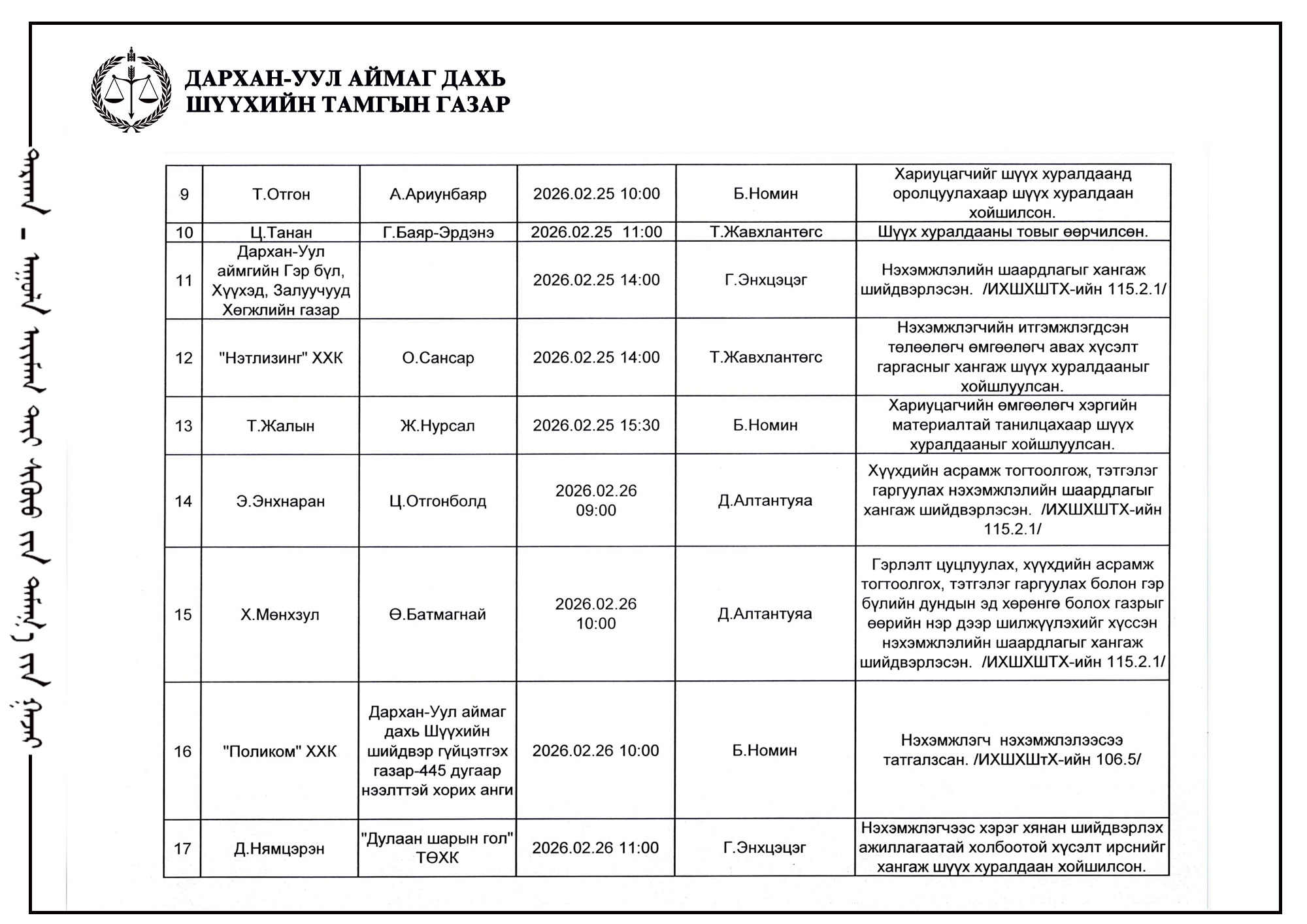 ЭРҮҮГИЙН БОЛОН ЗӨРЧЛИЙН ХЭРГИЙН ШҮҮХ ХУРАЛДААНЫ ТОВ /ДАРХАН-УУЛ АЙМАГ ДАХЬ СУМ ДУНДЫН АНХАН ШАТНЫ ШҮҮХ 2026.02.23-2026.02.27/