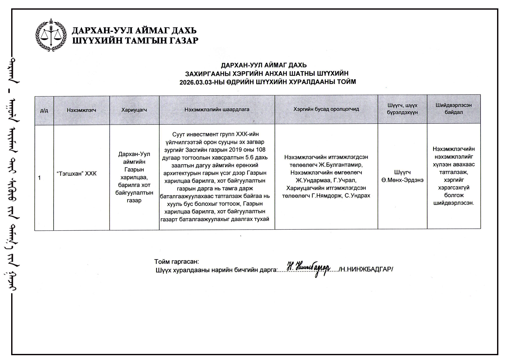 ШҮҮХ ХУРАЛДААНЫ ТОВ /ДАРХАН-УУЛ АЙМАГ ДАХЬ ЗАХИРГААНЫ ХЭРГИЙН АНХАН ШАТНЫ ШҮҮХ 2026.03.02-2026.03.06/