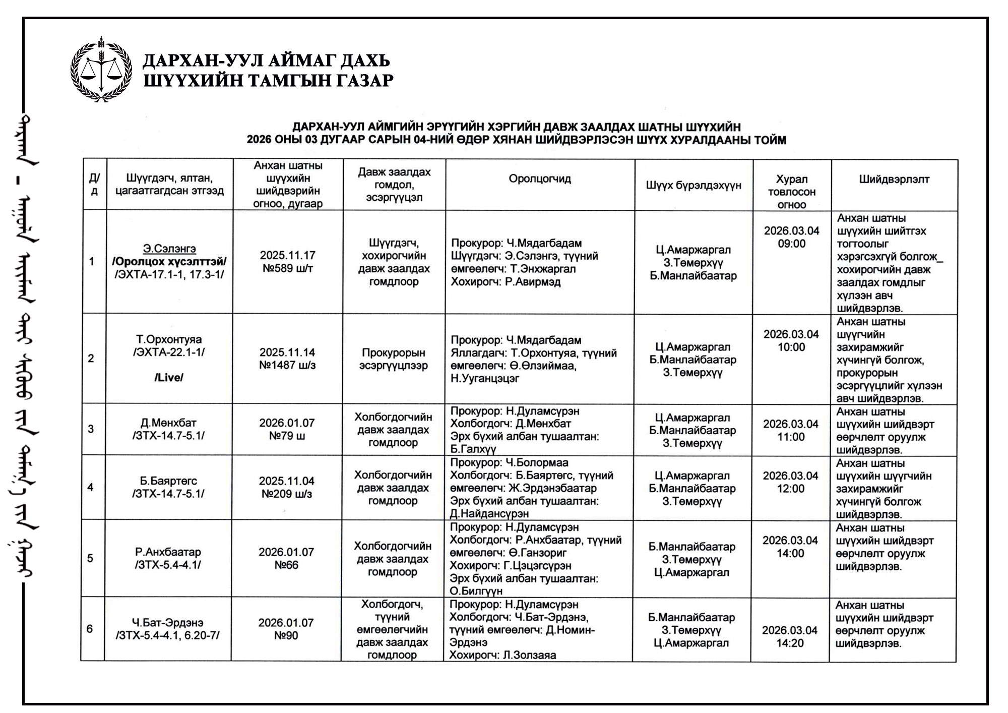 ШҮҮХ ХУРАЛДААНЫ ТОВ /ДАРХАН-УУЛ АЙМАГ ДАХЬ ЗАХИРГААНЫ ХЭРГИЙН АНХАН ШАТНЫ ШҮҮХ 2026.03.09-2026.03.13/