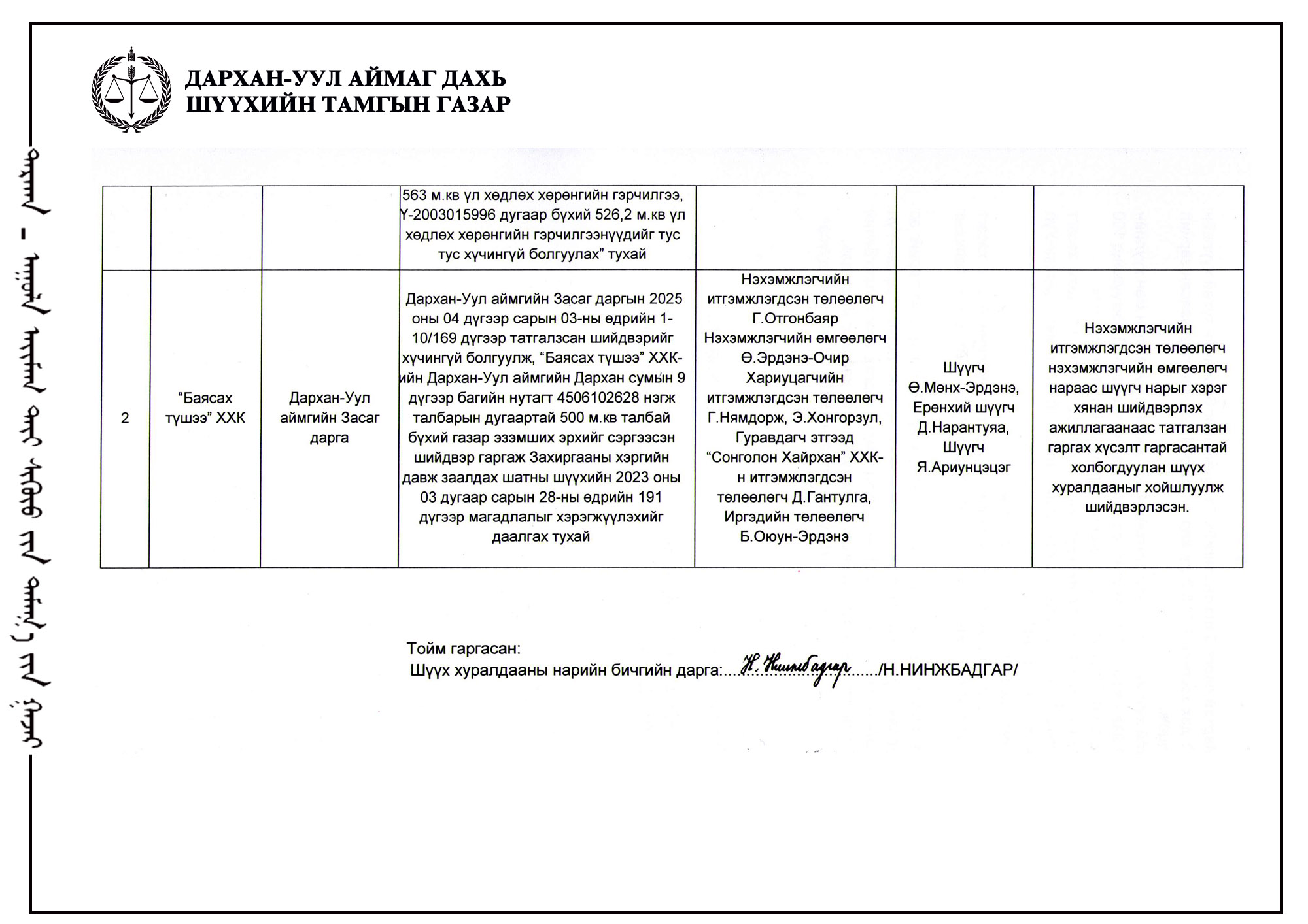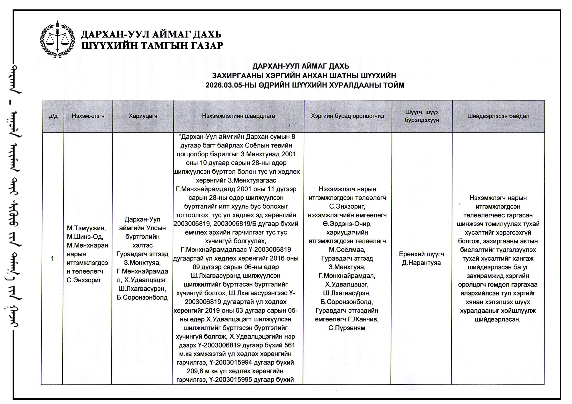 ШҮҮХ ХУРАЛДААНЫ ТОВ /ДАРХАН-УУЛ АЙМГИЙН ИРГЭНИЙ ХЭРГИЙН АНХАН ШАТНЫ ШҮҮХ 2026.03.02-2026.03.06/