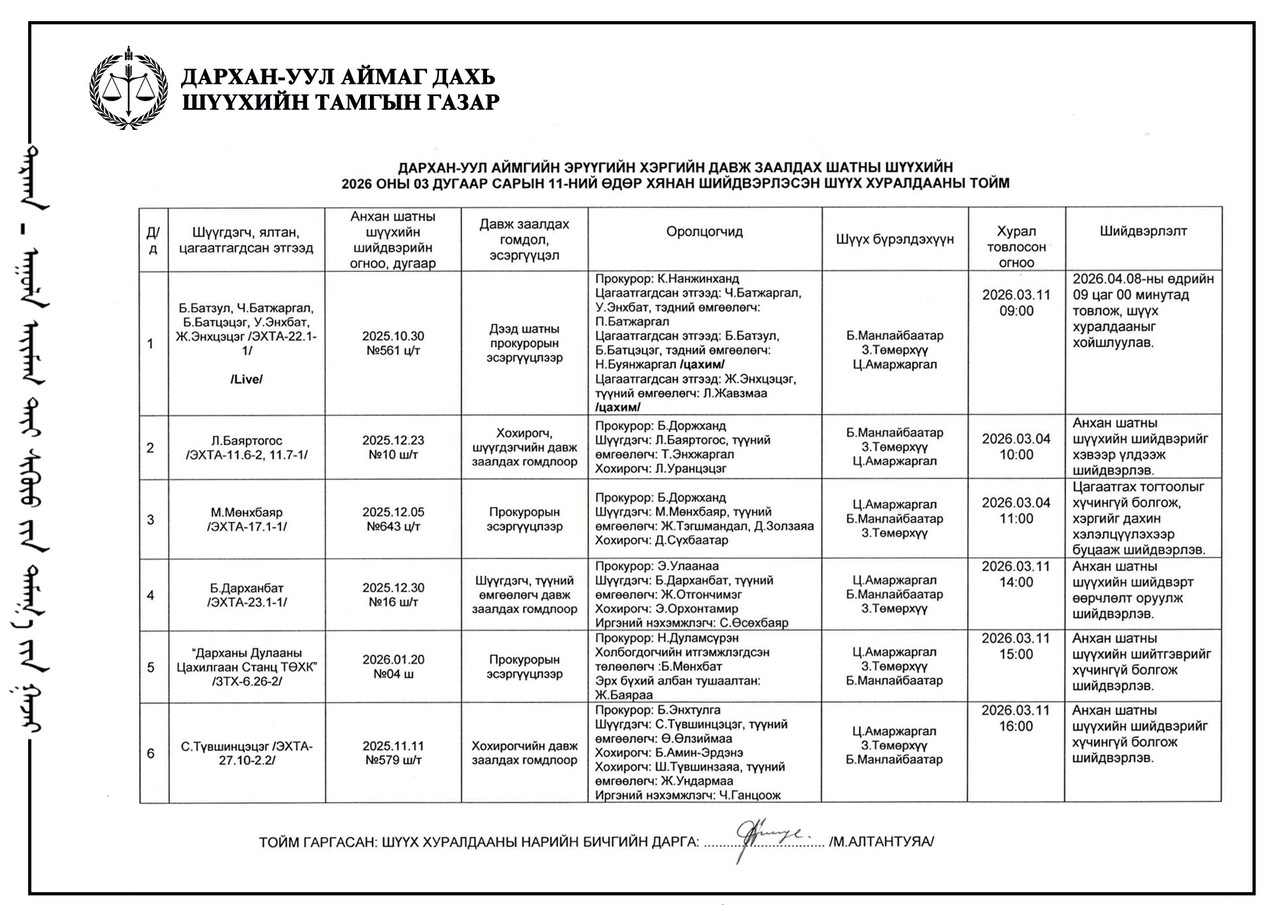 ШҮҮХ ХУРАЛДААНЫ ТОВ /ДАРХАН-УУЛ АЙМАГ ДАХЬ ЗАХИРГААНЫ ХЭРГИЙН АНХАН ШАТНЫ ШҮҮХ 2026.03.16-2026.03.20/