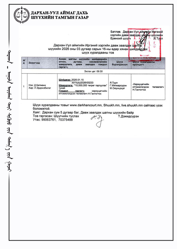 ШҮҮХ ХУРАЛДААНЫ ТОВ /ДАРХАН-УУЛ АЙМАГ ДАХЬ ЗАХИРГААНЫ ХЭРГИЙН АНХАН ШАТНЫ ШҮҮХ 2026.03.16-2026.03.20/