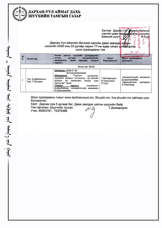 ШҮҮХ ХУРАЛДААНЫ ТОВ /ДАРХАН-УУЛ АЙМАГ ДАХЬ ЗАХИРГААНЫ ХЭРГИЙН АНХАН ШАТНЫ ШҮҮХ 2026.03.16-2026.03.20/