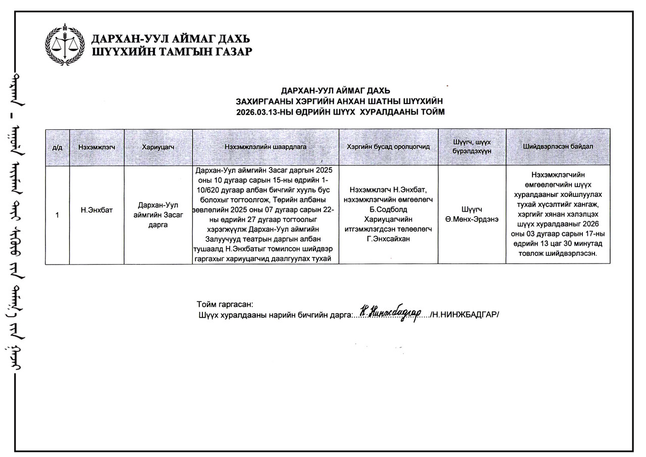 ШҮҮХ ХУРАЛДААНЫ ТОВ /ДАРХАН-УУЛ АЙМАГ ДАХЬ ЗАХИРГААНЫ ХЭРГИЙН АНХАН ШАТНЫ ШҮҮХ 2026.03.16-2026.03.20/