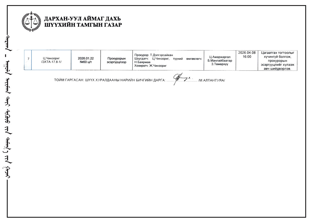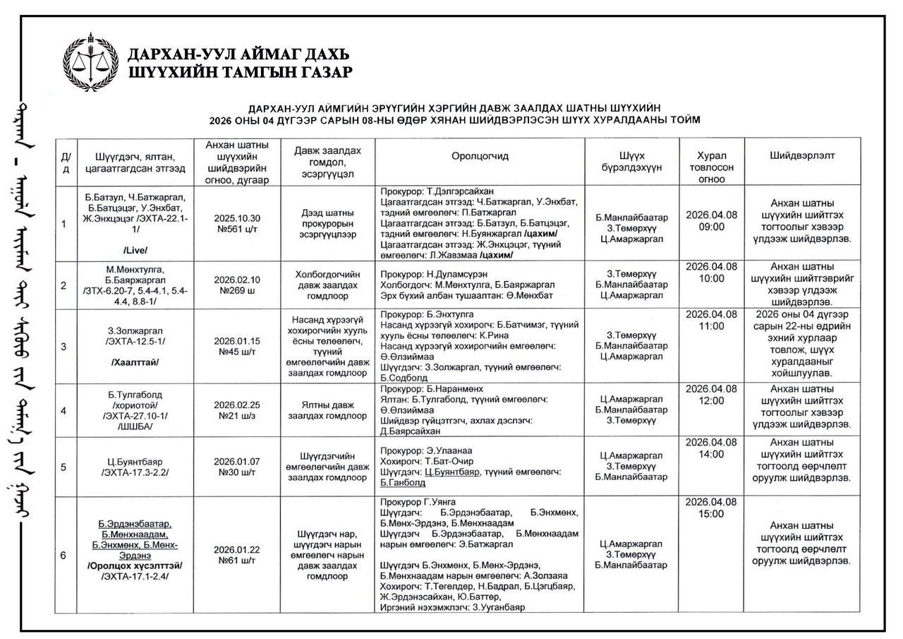 ШҮҮХ ХУРАЛДААНЫ ТОВ /ДАРХАН-УУЛ АЙМАГ ДАХЬ ЗАХИРГААНЫ ХЭРГИЙН АНХАН ШАТНЫ ШҮҮХ 2026.03.16-2026.03.20/
