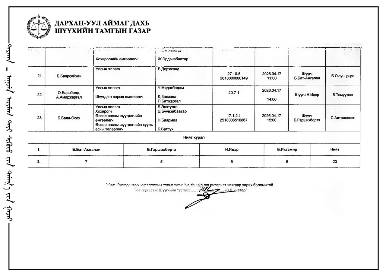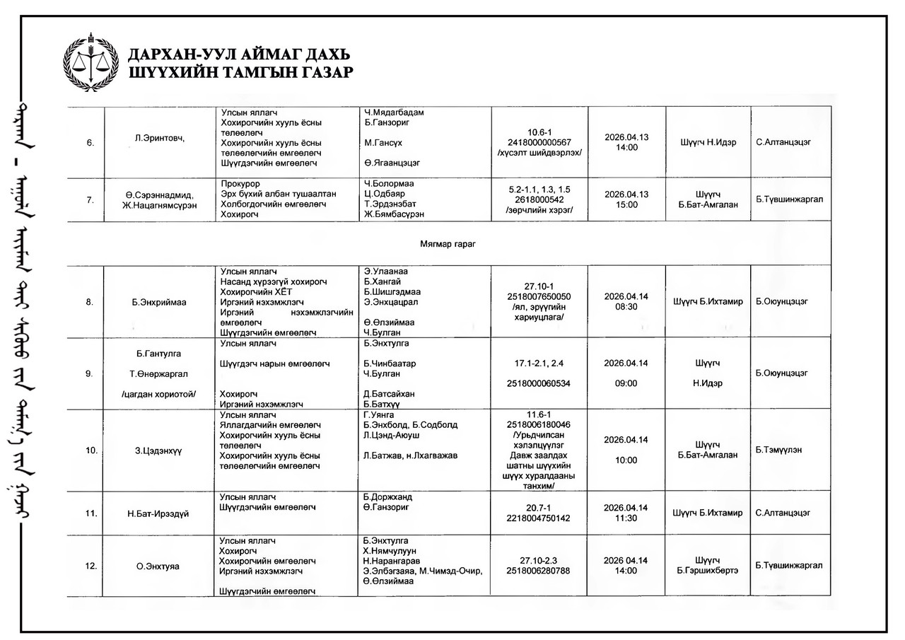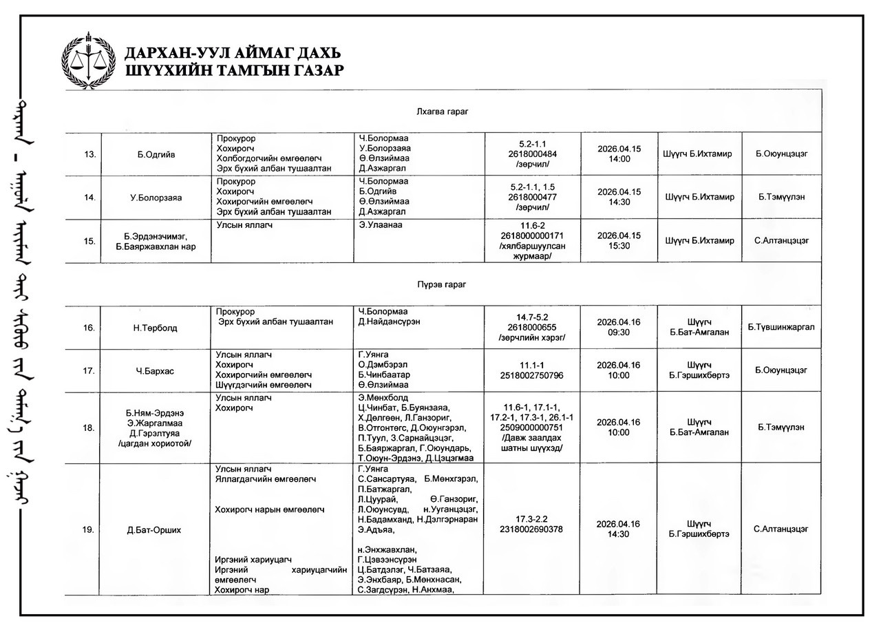 ЭРҮҮГИЙН БОЛОН ЗӨРЧЛИЙН ХЭРГИЙН ШҮҮХ ХУРАЛДААНЫ ТОВ /ДАРХАН-УУЛ АЙМАГ ДАХЬ СУМ ДУНДЫН АНХАН ШАТНЫ ШҮҮХ 2026.04.13-2026.04.17/
