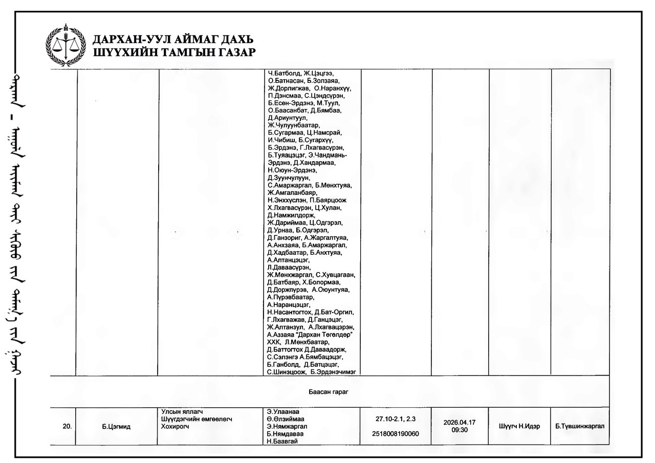 ШҮҮХ ХУРАЛДААНЫ ТОЙМ /ДАРХАН-УУЛ АЙМГИЙН ЭРҮҮГИЙН ХЭРГИЙН ДАВЖ ЗААЛДАХ ШАТНЫ ШҮҮХ 2026.04.08/
