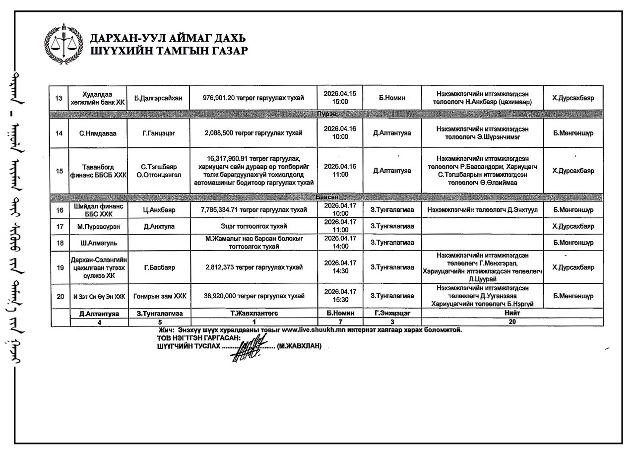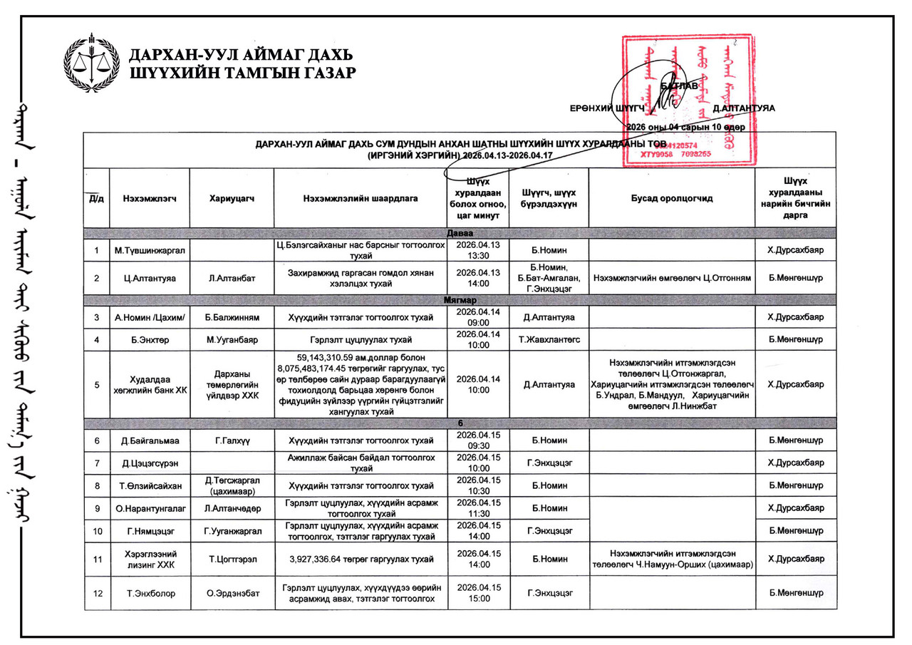 ИРГЭНИЙ ХЭРГИЙН ШҮҮХ ХУРАЛДААНЫ ТОВ /ДАРХАН-УУЛ АЙМАГ ДАХЬ СУМ ДУНДЫН АНХАН ШАТНЫ ШҮҮХ 2026.04.13-2026.04.17/
