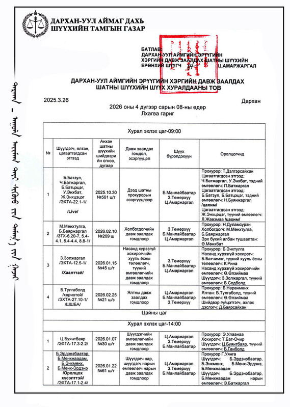 ШҮҮХ ХУРАЛДААНЫ ТОВ /ДАРХАН-УУЛ АЙМГИЙН ЭРҮҮГИЙН ХЭРГИЙН ДАВЖ ЗААЛДАХ ШАТНЫ ШҮҮХ 2026.04.08/