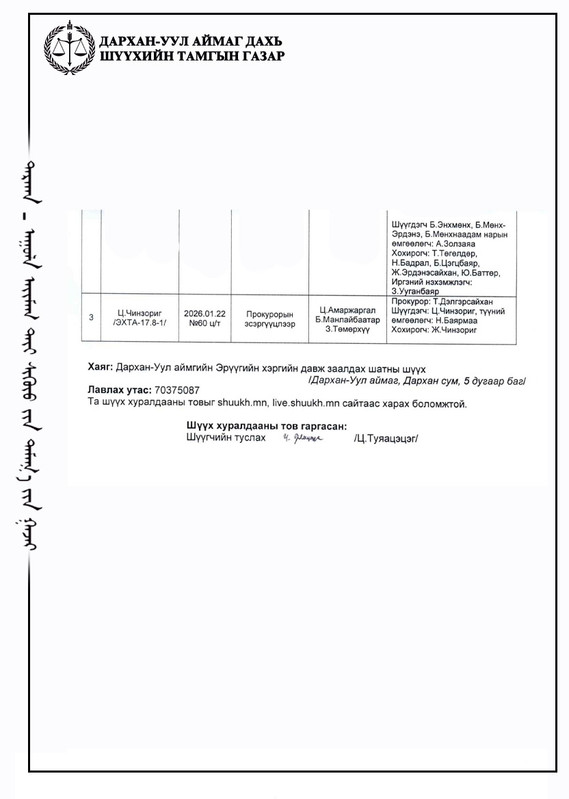ШҮҮХ ХУРАЛДААНЫ ТОВ /ДАРХАН-УУЛ АЙМАГ ДАХЬ ЗАХИРГААНЫ ХЭРГИЙН АНХАН ШАТНЫ ШҮҮХ 2026.04.13-2026.04.17/