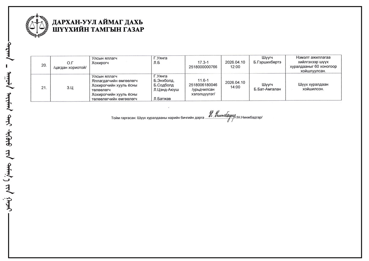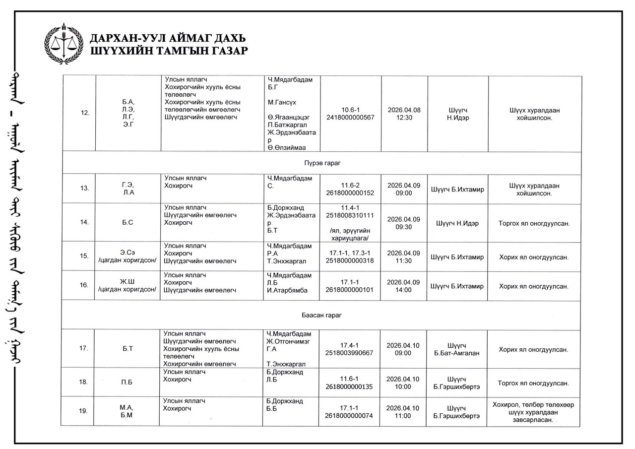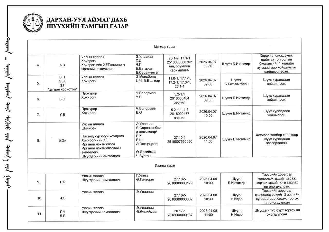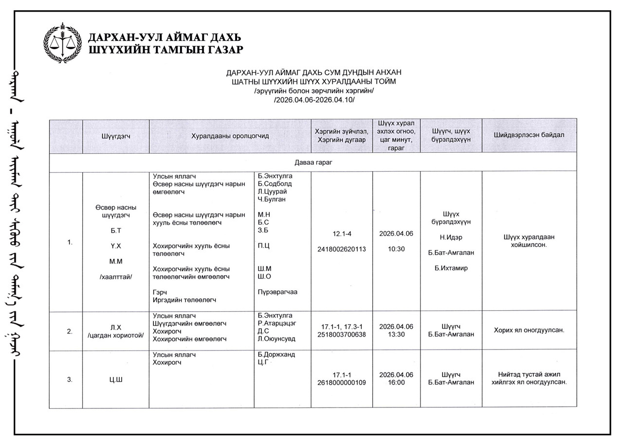 ШҮҮХ ХУРАЛДААНЫ ТОВ /ДАРХАН-УУЛ АЙМАГ ДАХЬ ЗАХИРГААНЫ ХЭРГИЙН АНХАН ШАТНЫ ШҮҮХ 2026.04.13-2026.04.17/