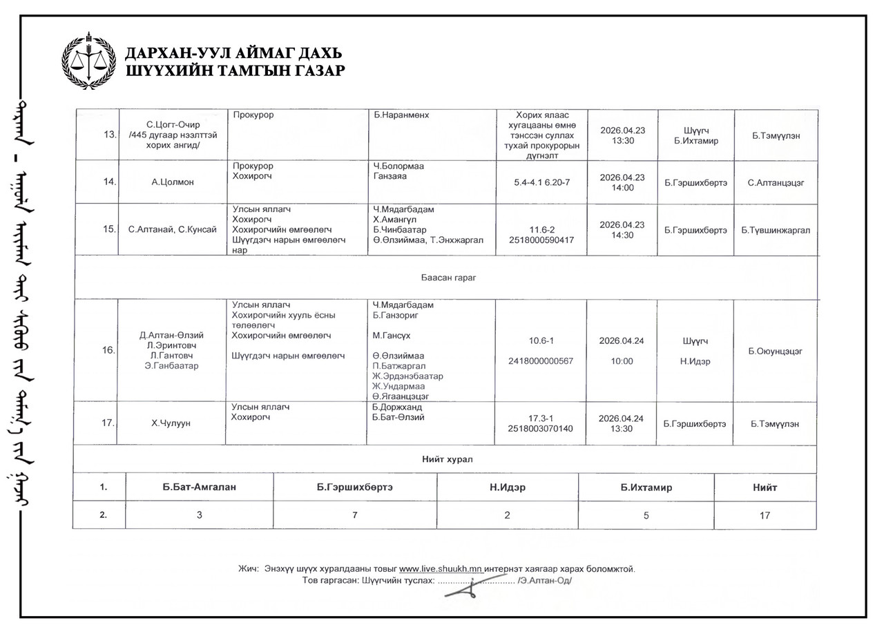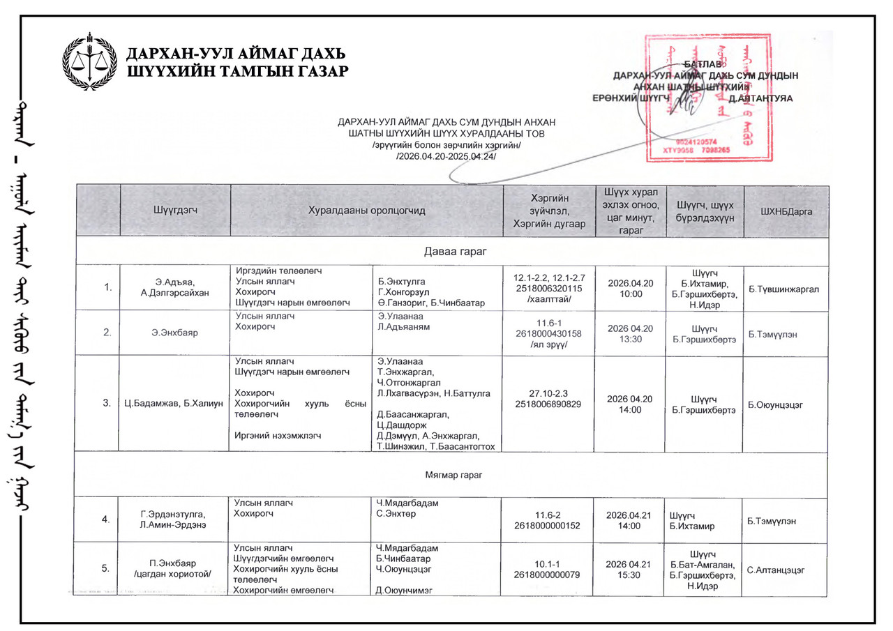 ШҮҮХ ХУРАЛДААНЫ ТОВ /ДАРХАН-УУЛ АЙМАГ ДАХЬ ЗАХИРГААНЫ ХЭРГИЙН АНХАН ШАТНЫ ШҮҮХ 2026.04.20-2026.04.24/
