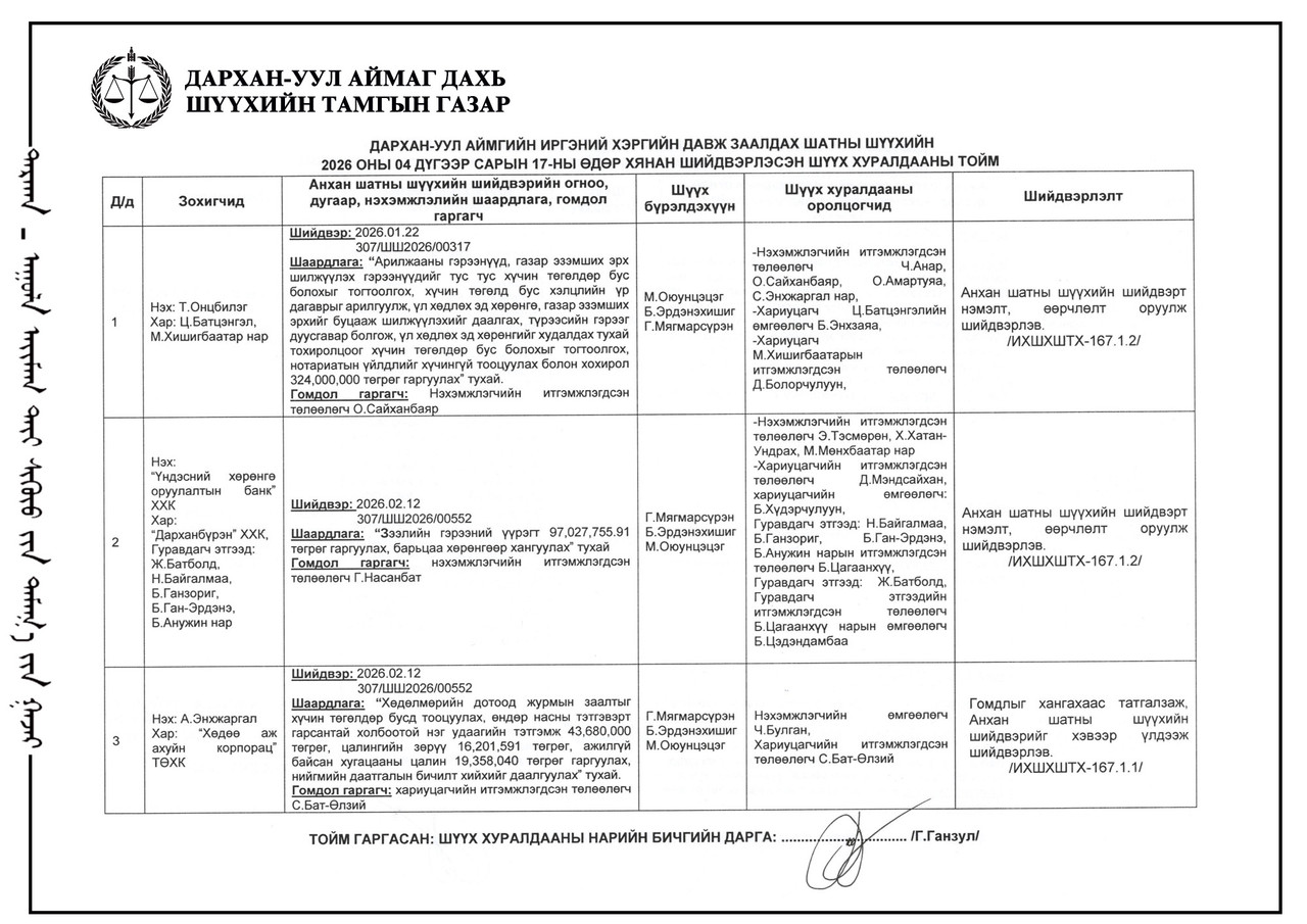 ДАРХАН-УУЛ АЙМАГ ДАХЬ ЗАХИРГААНЫ ХЭРГИЙН АНХАН ШАТНЫ ШҮҮХИЙН ШҮҮХ ХУРАЛДААНЫ ТОЙМ /2026.04.17/