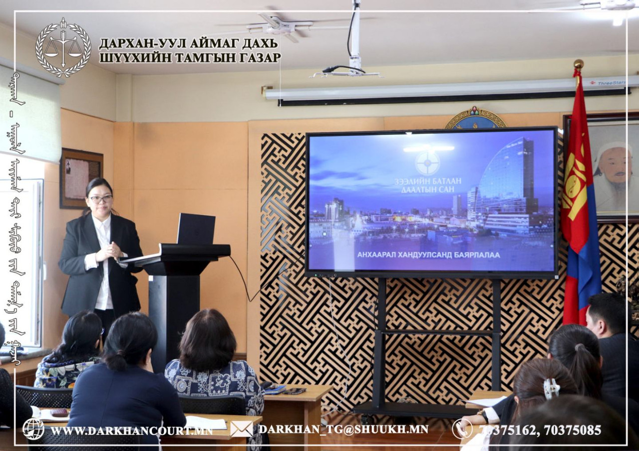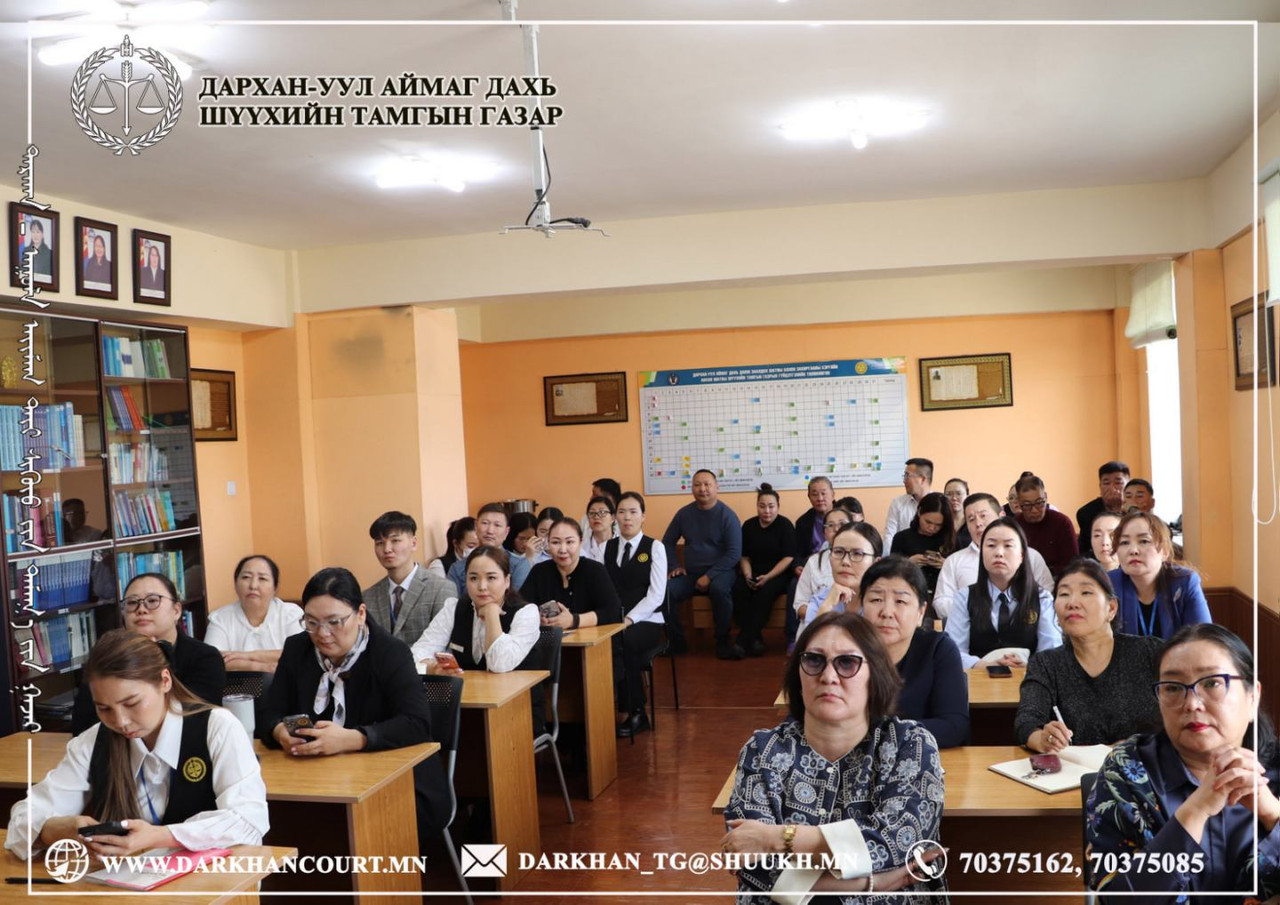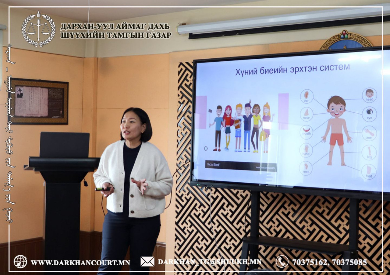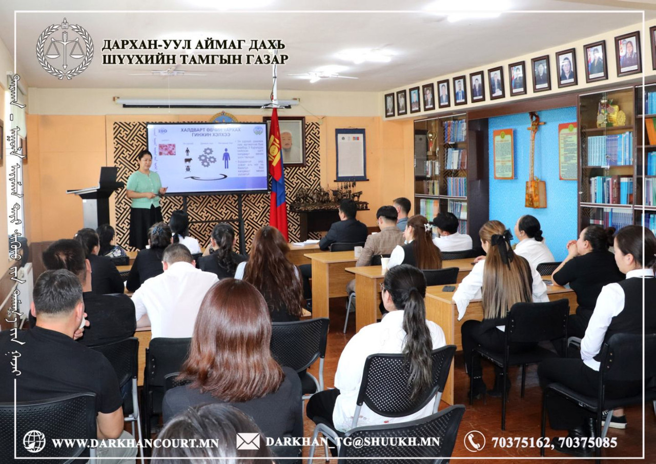 2026-04-17 | 47Байгууллагын сургалтын төлөвлөгөөний дагуу шүүгч, шүүхийн захиргааны ажилтнуудад Дархан-Уул аймгийн Эрүүл мэндийн газрын тархвал судлаач, их эмч Л.Өлзийжаргал, арга зүйч Ц.Ариунханд нар “Халдварт өвчний талаарх ерөнхий ойлголт, дархлаажуулалт” сэдвээр, БЗХӨ, ДОХ хөтөлбөрийн эмч Б.Гэрэлмаа, арга зүйч Д.Золжаргал нар “Бэлгийн замаар дамжих халдвараас сэргийлэх нь” сэдвүүдээр тус тус сургалт зохион байгууллаа.