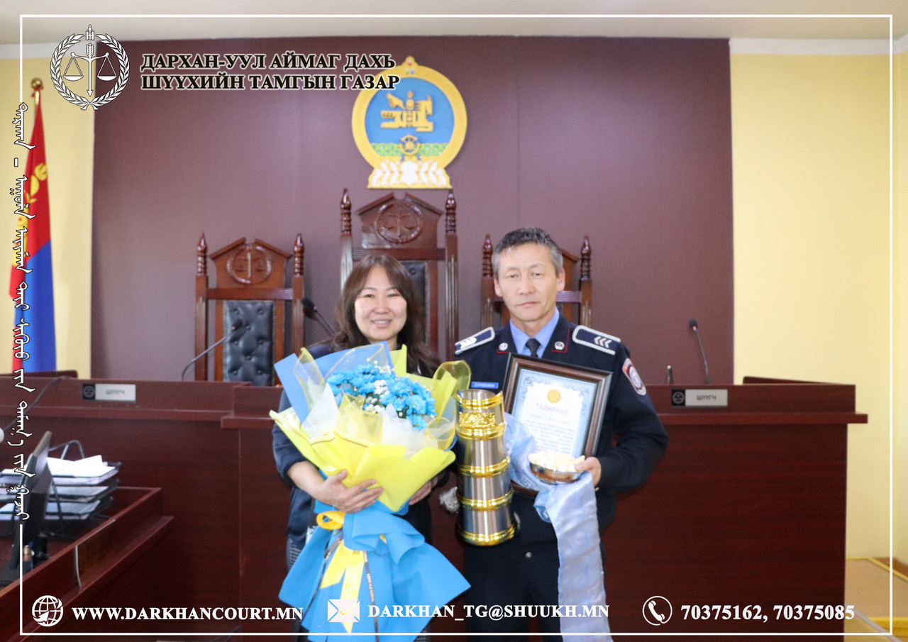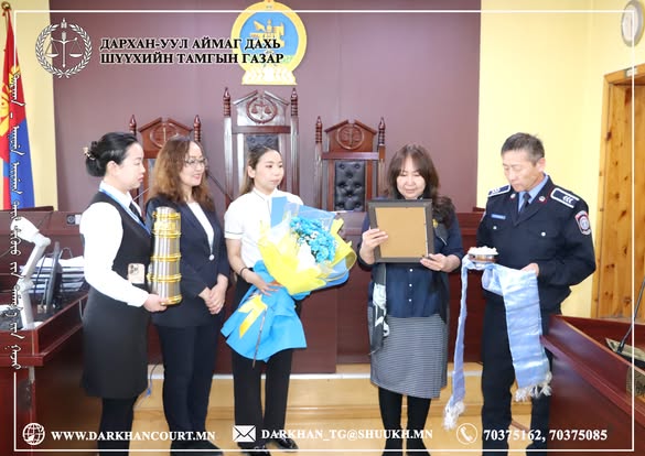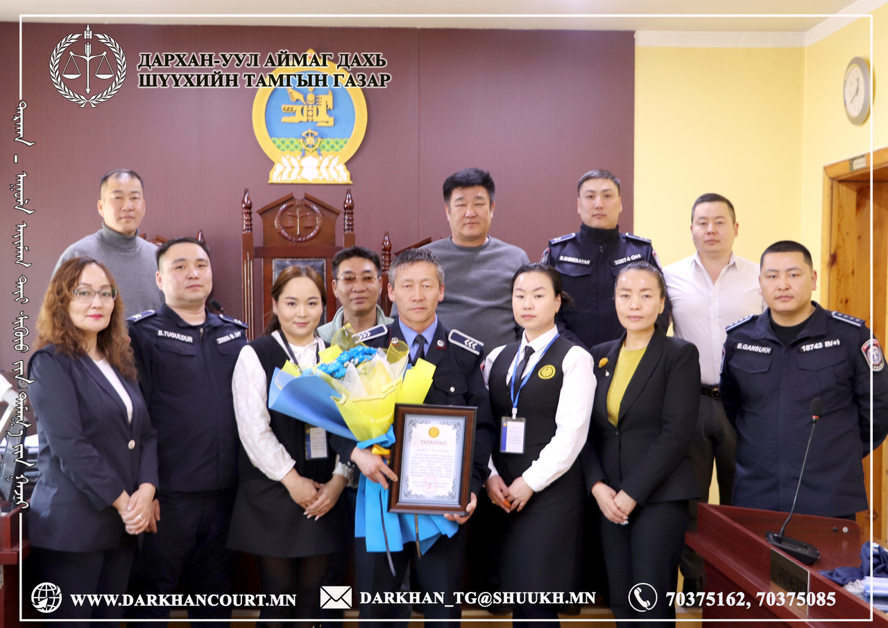 Дархан-Уул аймгийн Цагдаагийн газрын Нийтийн хэв журам хамгаалах, олон нийтийн аюулгүй байдлыг хангах тасгийн харуулын цагдаа, цагдаагийн ахлах ахлагч Д.Пүрэвсайхан Монгол Улсын төрийн тусгай албан хаагчаар олон жил үр бүтээлтэй ажиллаж цэргийн тэтгэврээ тогтоолгон 2026 оны 04 дүгээр сарын 01-ний өдөр үүрэгт ажлаасаа чөлөөлөгдсөнд шүүх, шүүхийн Тамгын газрын хамт олон хүндэтгэл үзүүлж “Талархал”, дурсгалын зүйл гардуулав.