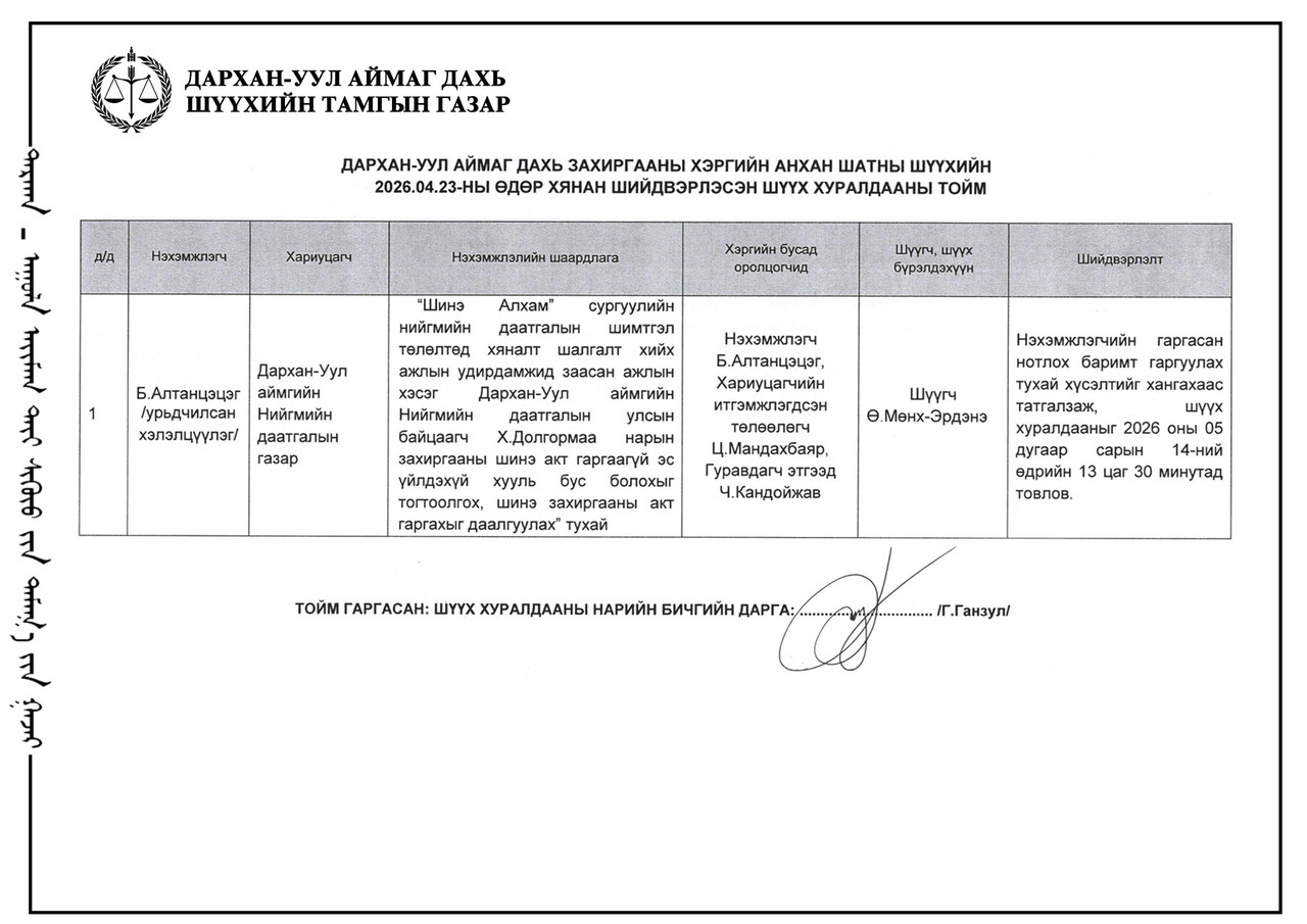 ДАРХАН-УУЛ АЙМАГ ДАХЬ ЗАХИРГААНЫ ХЭРГИЙН АНХАН ШАТНЫ ШҮҮХИЙН ШҮҮХ ХУРАЛДААНЫ ТОЙМ /2026.04.23/
