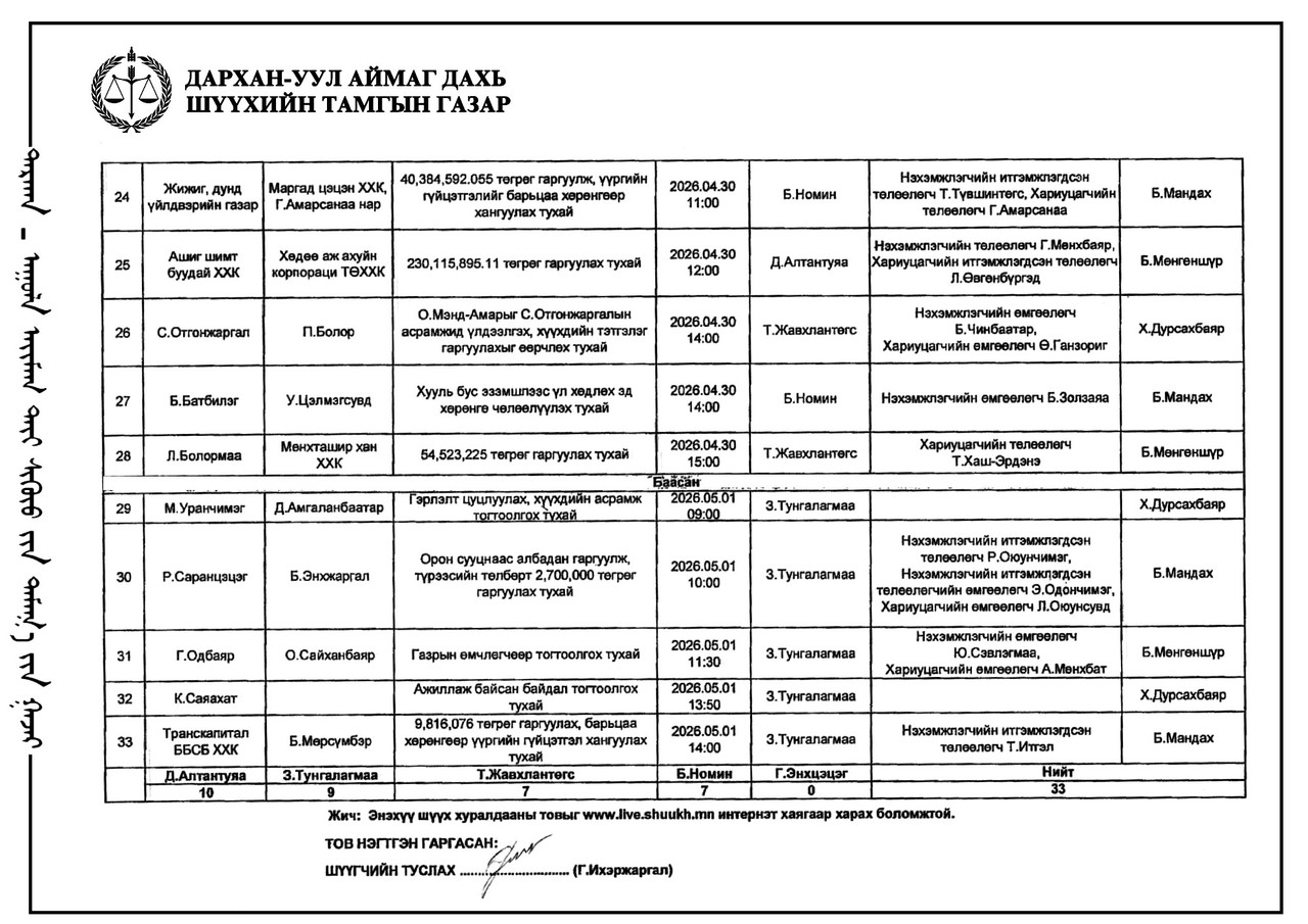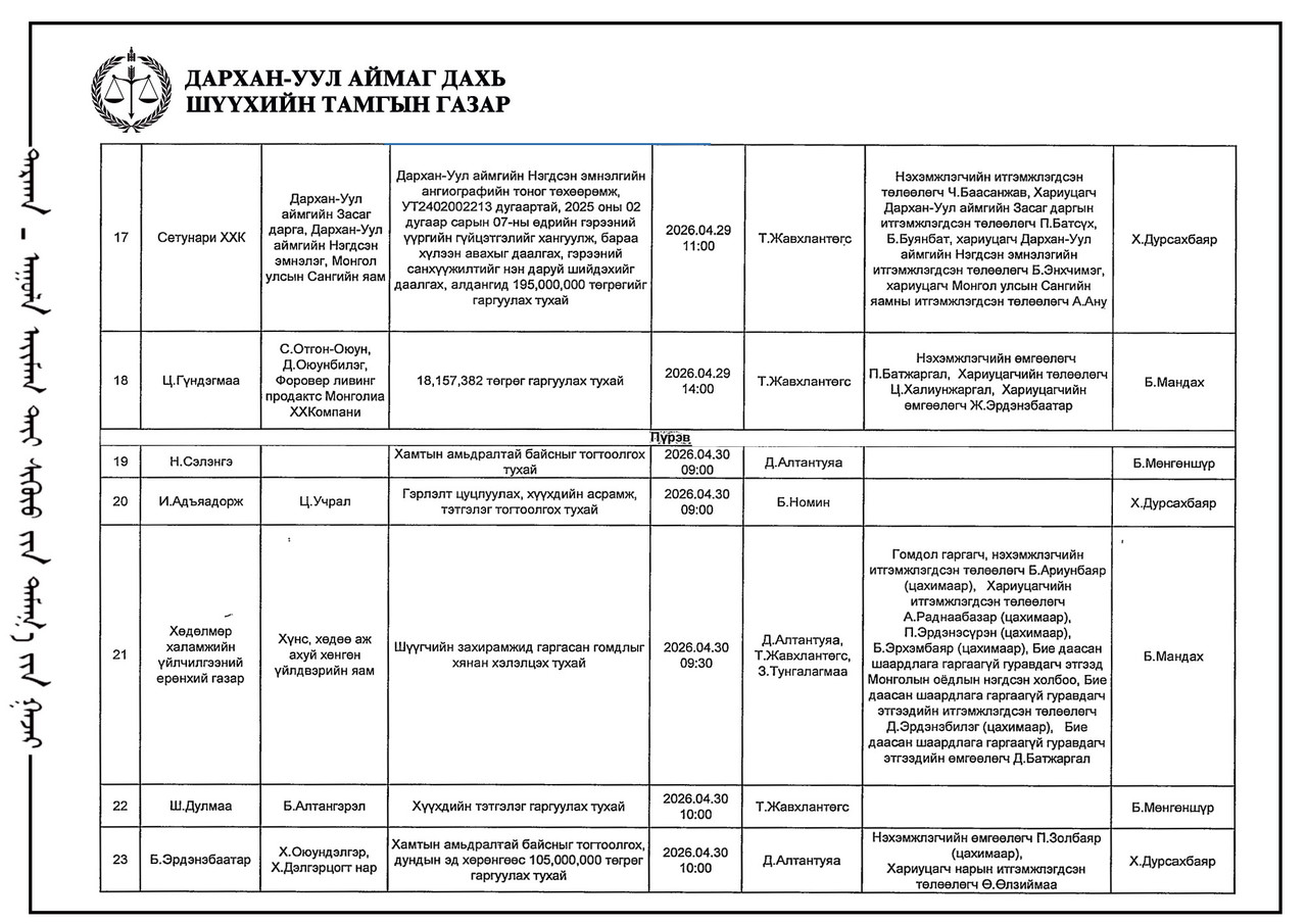 ДАРХАН-УУЛ АЙМАГ ДАХЬ ЗАХИРГААНЫ ХЭРГИЙН АНХАН ШАТНЫ ШҮҮХИЙН ШҮҮХ ХУРАЛДААНЫ ТОЙМ /2026.04.23/