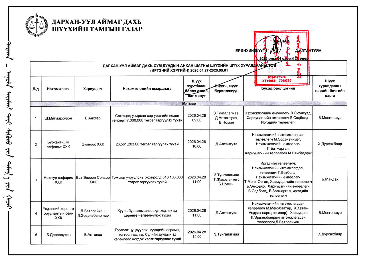 ИРГЭНИЙ ХЭРГИЙН ШҮҮХ ХУРАЛДААНЫ ТОВ /ДАРХАН-УУЛ АЙМАГ ДАХЬ СУМ ДУНДЫН АНХАН ШАТНЫ ШҮҮХ 2026.04.27-2026.05.01/