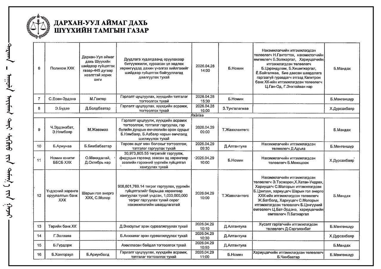 ЭРҮҮГИЙН БОЛОН ЗӨРЧЛИЙН ХЭРГИЙН ШҮҮХ ХУРАЛДААНЫ ТОВ /ДАРХАН-УУЛ АЙМАГ ДАХЬ СУМ ДУНДЫН АНХАН ШАТНЫ ШҮҮХ 2026.04.27-2026.05.01/