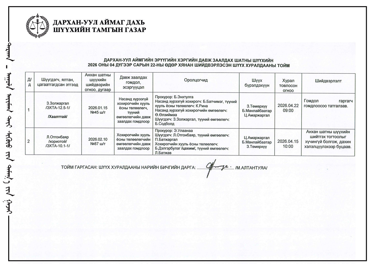ДАРХАН-УУЛ АЙМАГ ДАХЬ ЗАХИРГААНЫ ХЭРГИЙН АНХАН ШАТНЫ ШҮҮХИЙН ШҮҮХ ХУРАЛДААНЫ ТОЙМ /2026.04.22/
