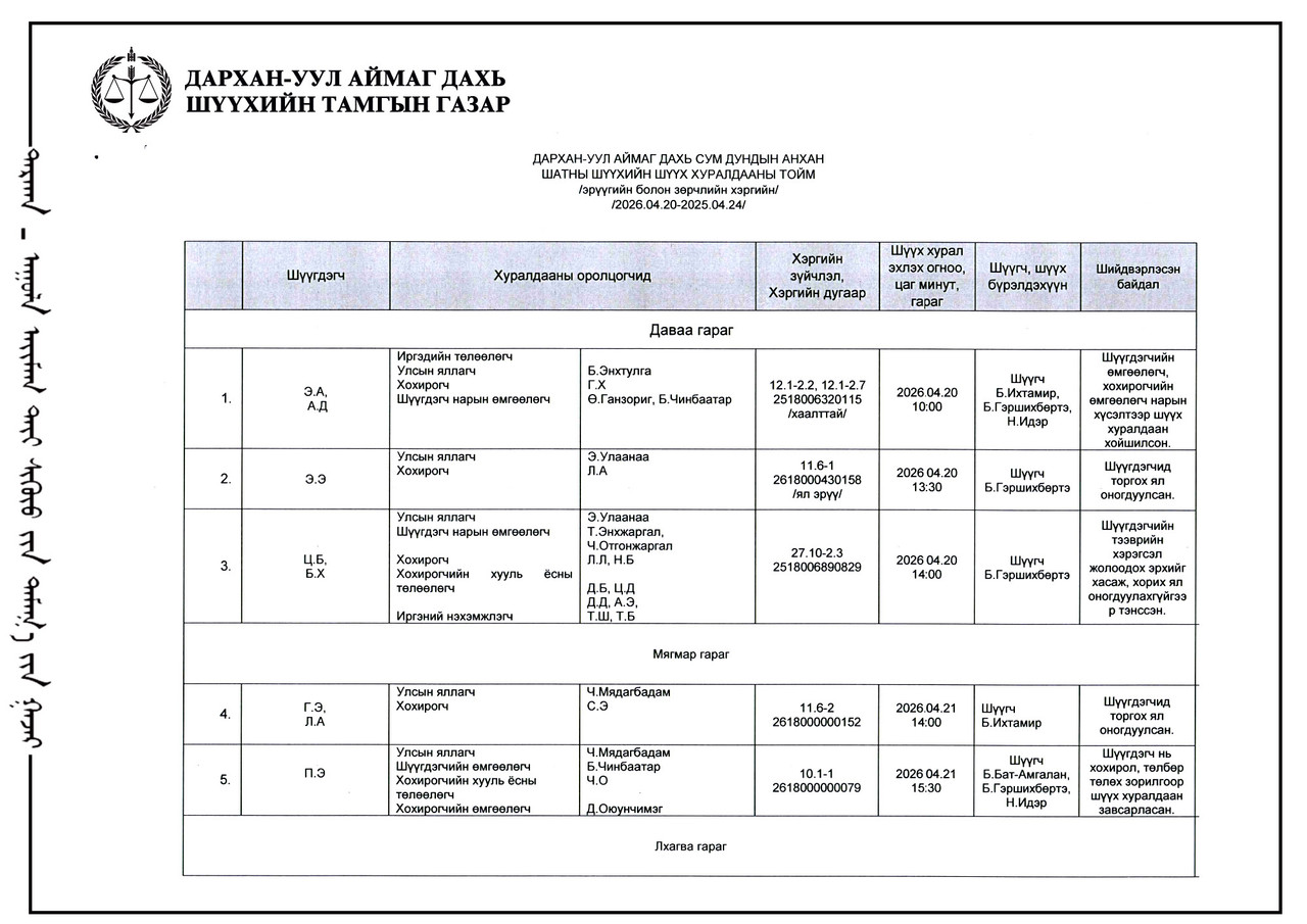 ИРГЭНИЙ ХЭРГИЙН ШҮҮХ ХУРАЛДААНЫ ТОЙМ /ДАРХАН-УУЛ АЙМАГ ДАХЬ СУМ ДУНДЫН АНХАН ШАТНЫ ШҮҮХ 2026.04.20-2026.04.24/
