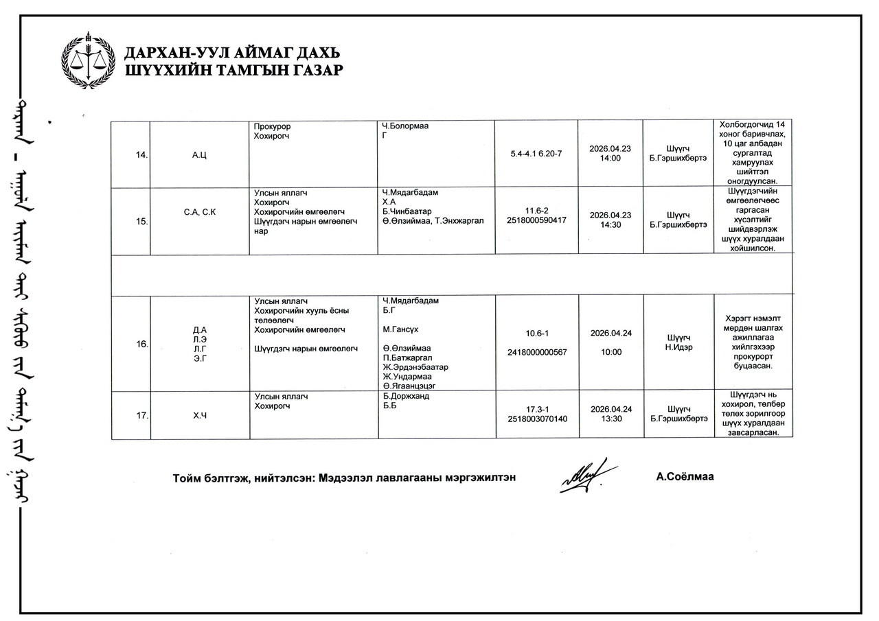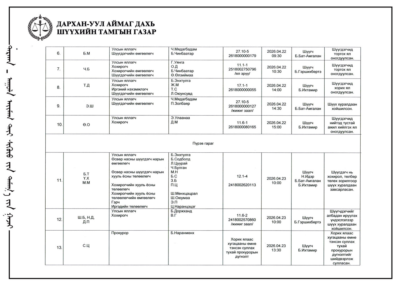 ЭРҮҮГИЙН БОЛОН ЗӨРЧЛИЙН ХЭРГИЙН ШҮҮХ ХУРАЛДААНЫ ТОВ /ДАРХАН-УУЛ АЙМАГ ДАХЬ СУМ ДУНДЫН АНХАН ШАТНЫ ШҮҮХ 2026.04.27-2026.05.01/