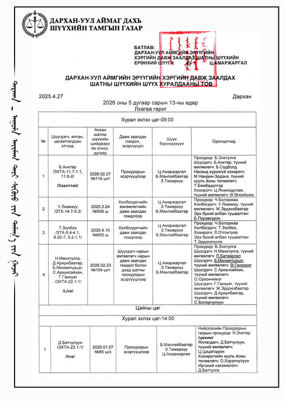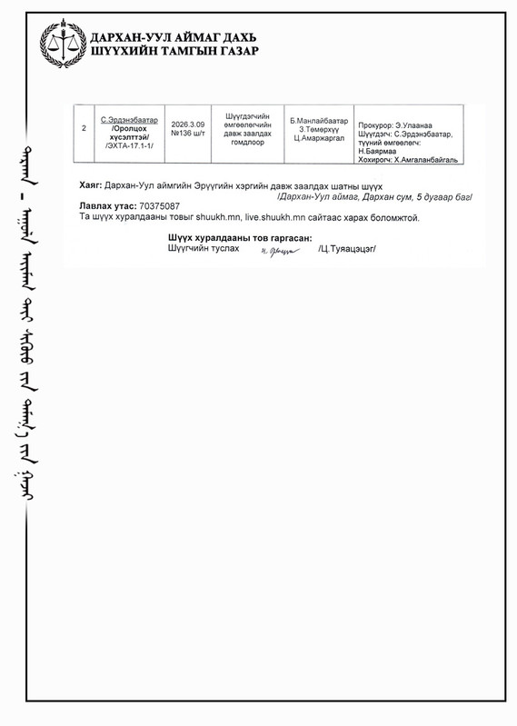 ШҮҮХ ХУРАЛДААНЫ ТОВ /ДАРХАН-УУЛ АЙМГИЙН ЭРҮҮГИЙН ХЭРГИЙН ДАВЖ ЗААЛДАХ ШАТНЫ ШҮҮХ 2026.05.13/