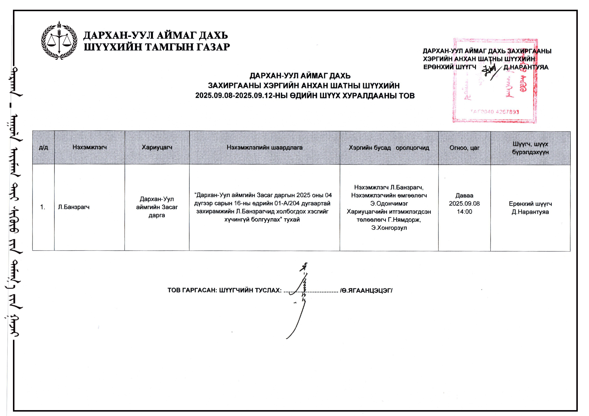 ШҮҮХ ХУРАЛДААНЫ ТОВ /Захиргааны хэргийн анхан шатны шүүх 2025.09.08-09.12/