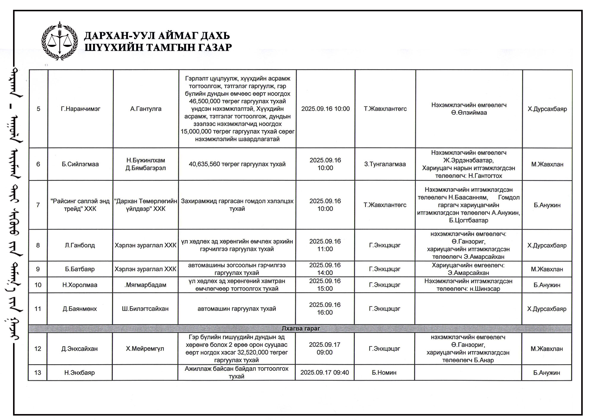 ШҮҮХ ХУРАЛДААНЫ ТОВ /Иргэний хэргийн анхан шатны шүүх 2025.09.15-19/