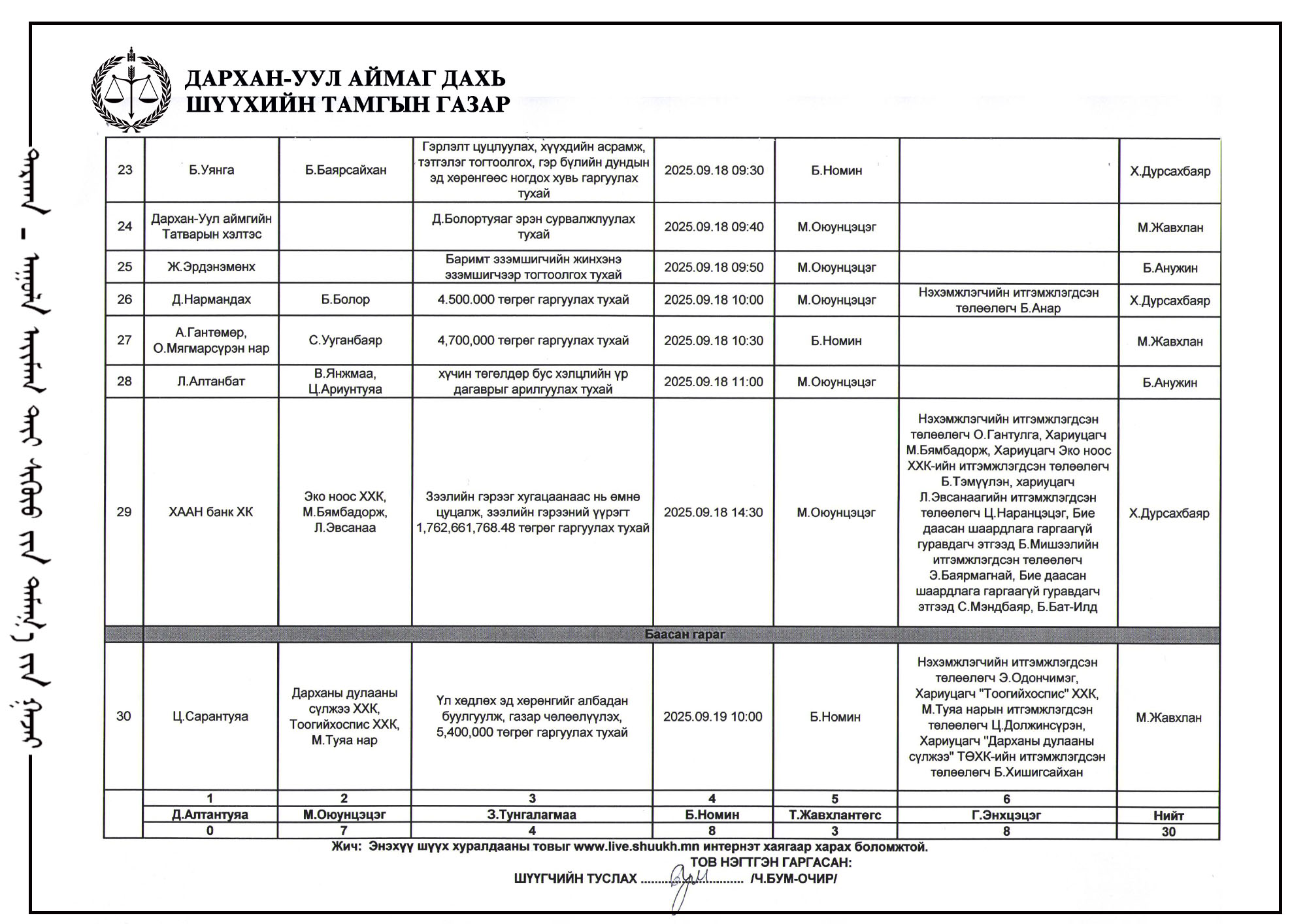 ШҮҮХ ХУРАЛДААНЫ ТОЙМ /Иргэний хэргийн анхан шатны шүүх 2025.10.27-10.31/
