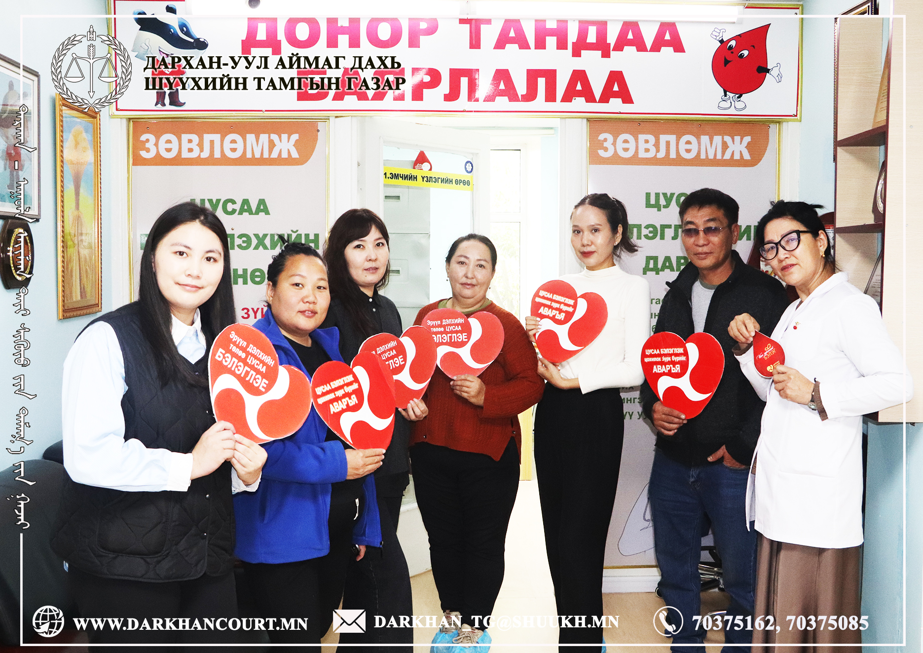 Тус шүүхийн хэмжээнд анх удаа болон 75 удаа цусаа хандивласан шүүгч, ажилтнууд байдаг бөгөөд улс үндэстэн бүхэнд цус, цусан бүтээгдэхүүний хангалттай нөөцтэй байх нь хүн амын эрүүл мэндийг сахин хамгаалах их үйлсийн үнэ цэнтэй салшгүй холбоотой тул иргэн, байгууллага хамт олныг цусаа хандивлах сайн үйлсэд нэгдэхийг Дархан-Уул аймаг дахь шүүхийн хамт олны зүгээс уриалж байна.