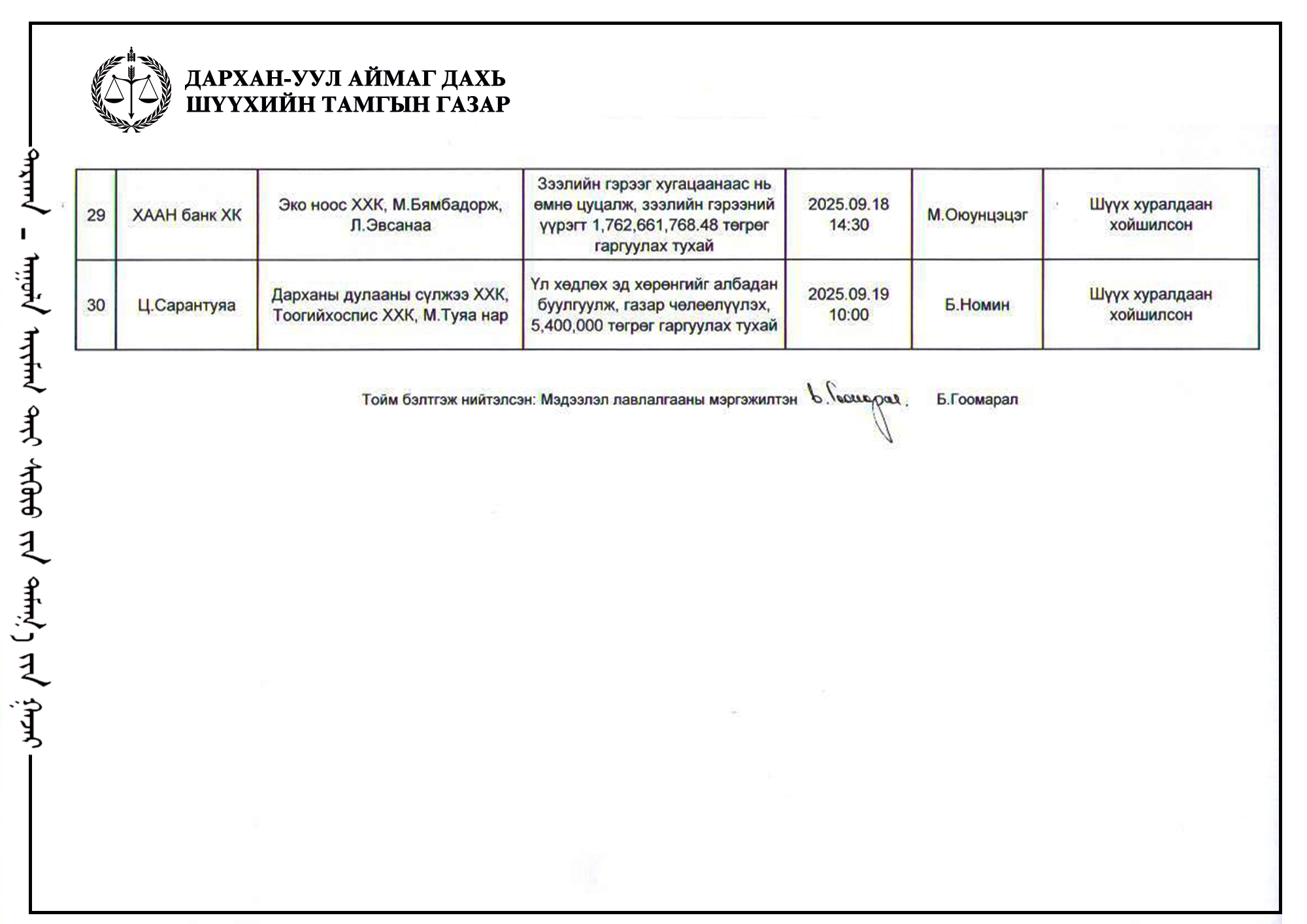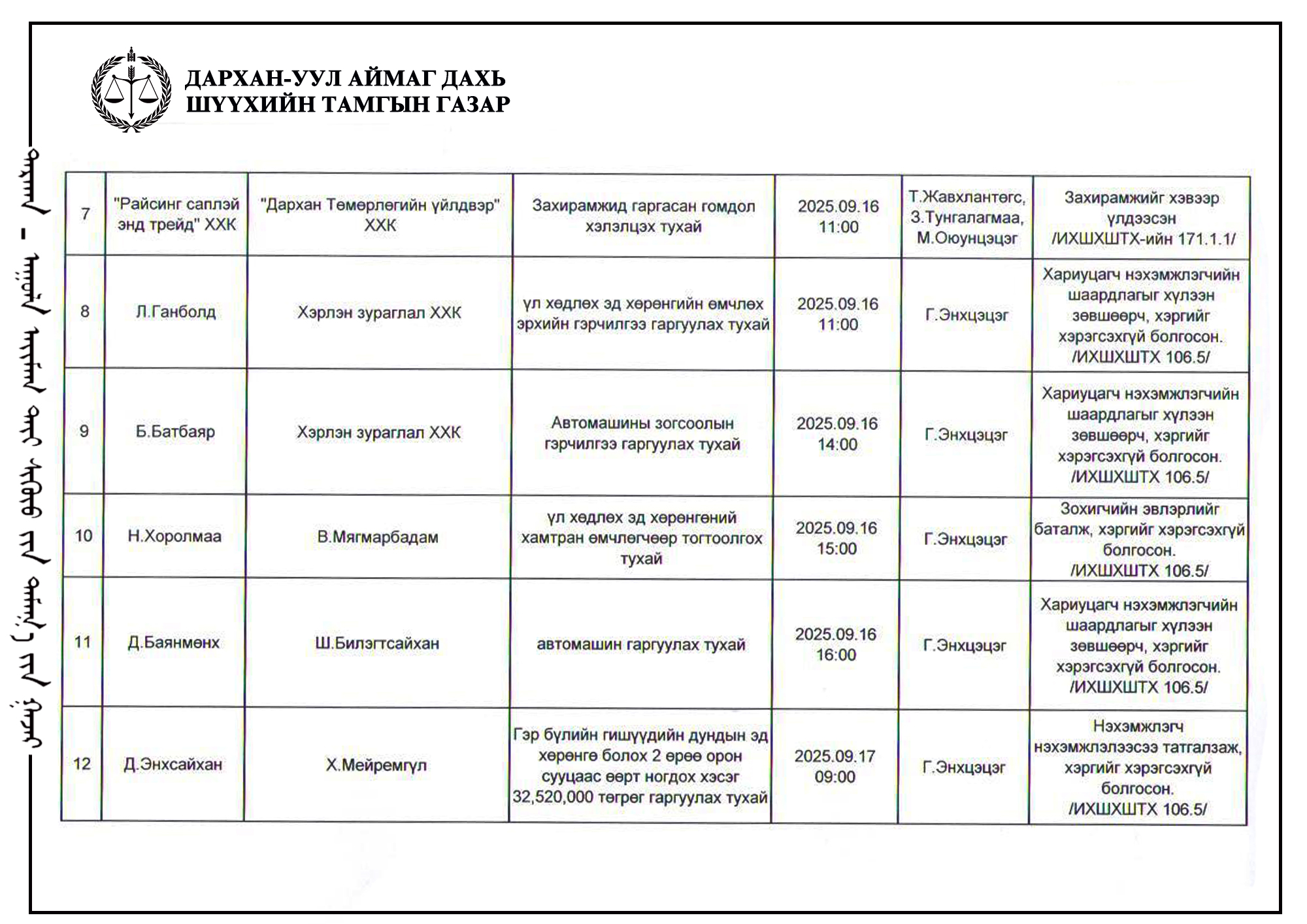 ШҮҮХ ХУРАЛДААНЫ ТОЙМ /Иргэний хэргийн анхан шатны шүүх 2025.09.15-19/