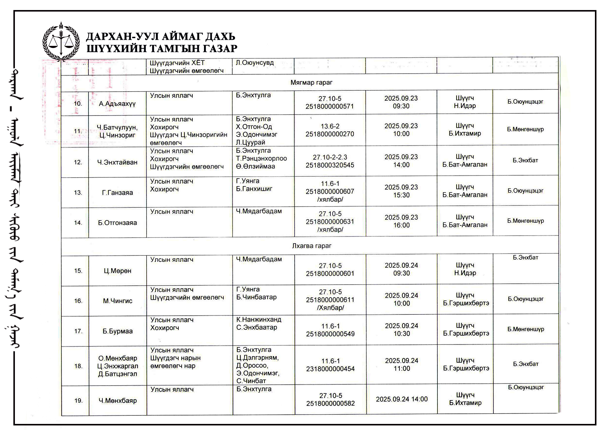 ШҮҮХ ХУРАЛДААНЫ ТОЙМ /Иргэний хэргийн анхан шатны шүүх 2025.09.15-19/