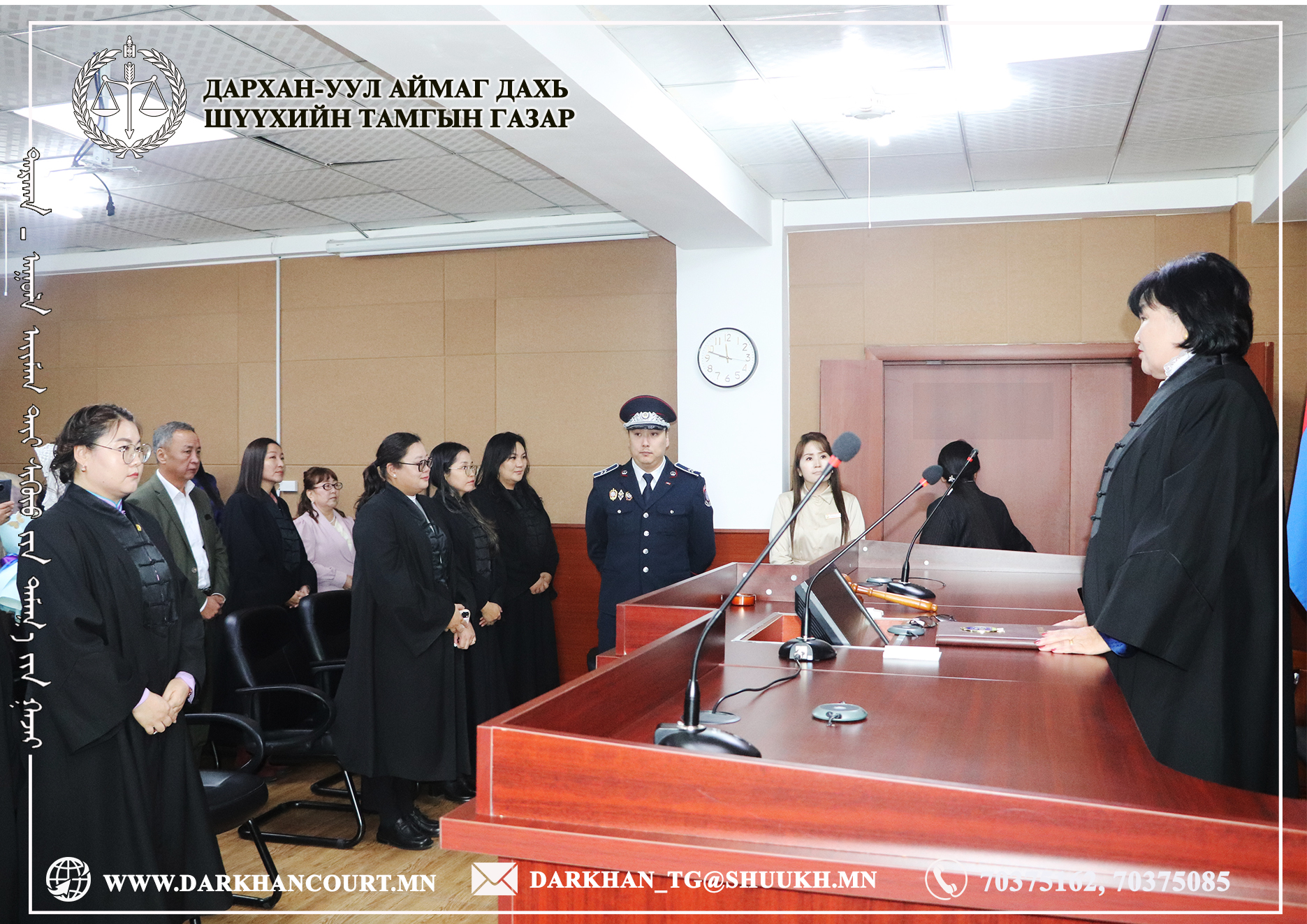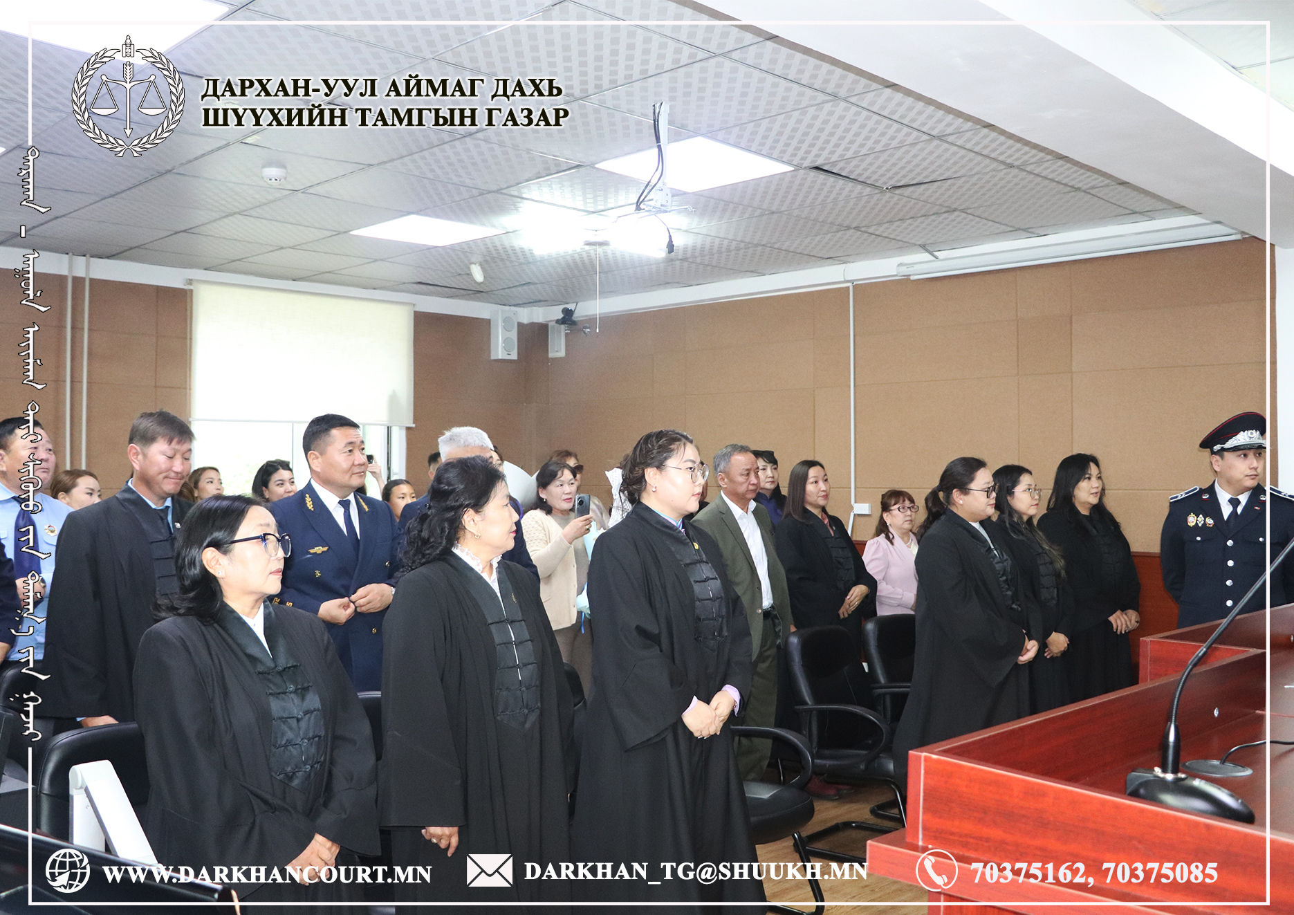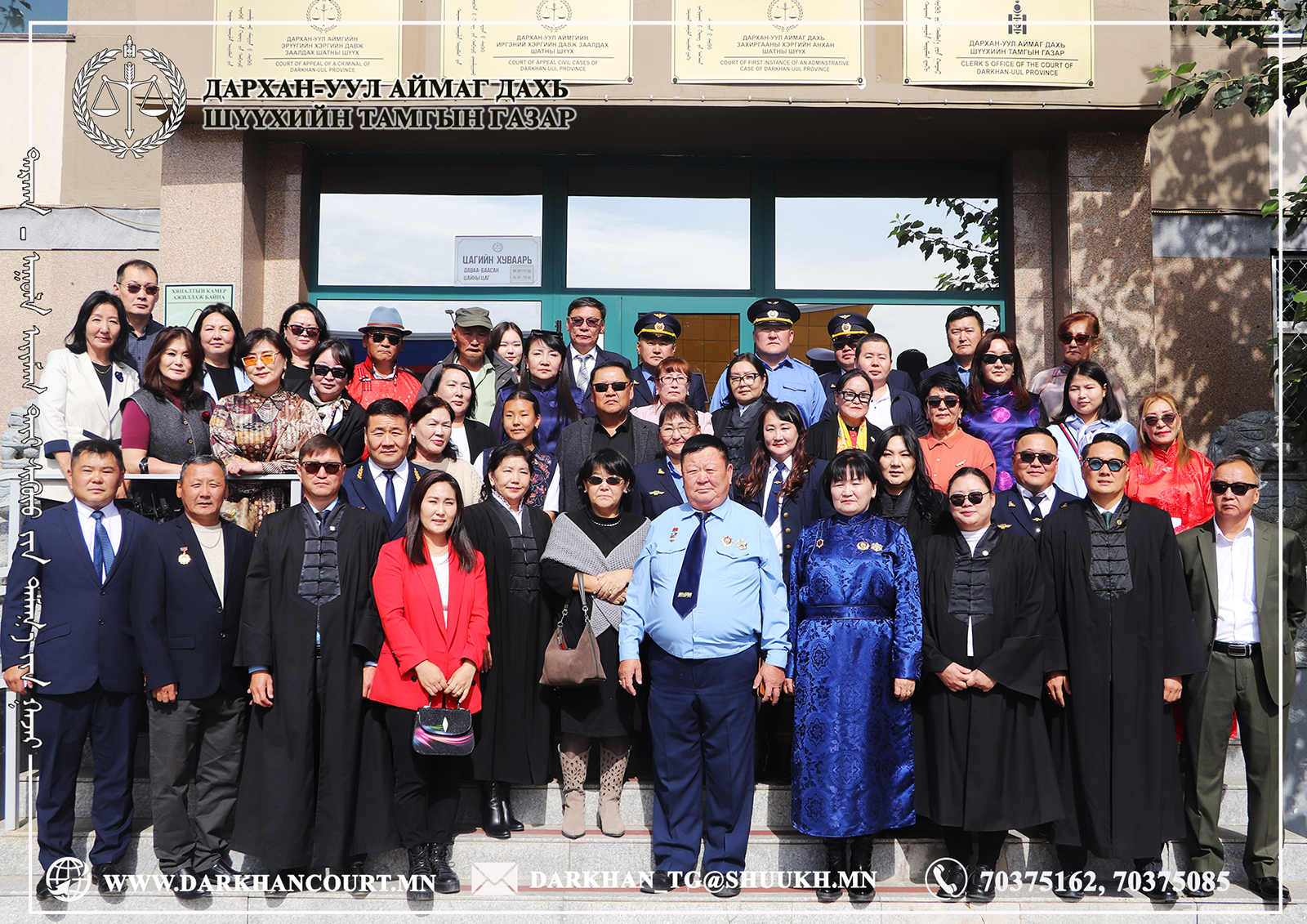 2025-10-11 | 79Дархан-Уул аймаг дахь Захиргааны хэргийн анхан шатны шүүхийн шүүгч Ж.Оюунчимэг өндөр насны тэтгэвэрт гарах насны дээд хязгаарт хүрч Монгол Улсын Ерөнхийлөгчийн 2025 оны 07 дугаар сарын 07-ны өдрийн 99 дүгээр зарлигаар шүүгчийн албан тушаалаас чөлөөлөгдсөнтэй холбогдуулан “Хүндэтгэлийн шүүх хуралдаан”-ыг 2025 оны 09 дүгээр сарын 19-ний өдөр зохион байгууллаа.
