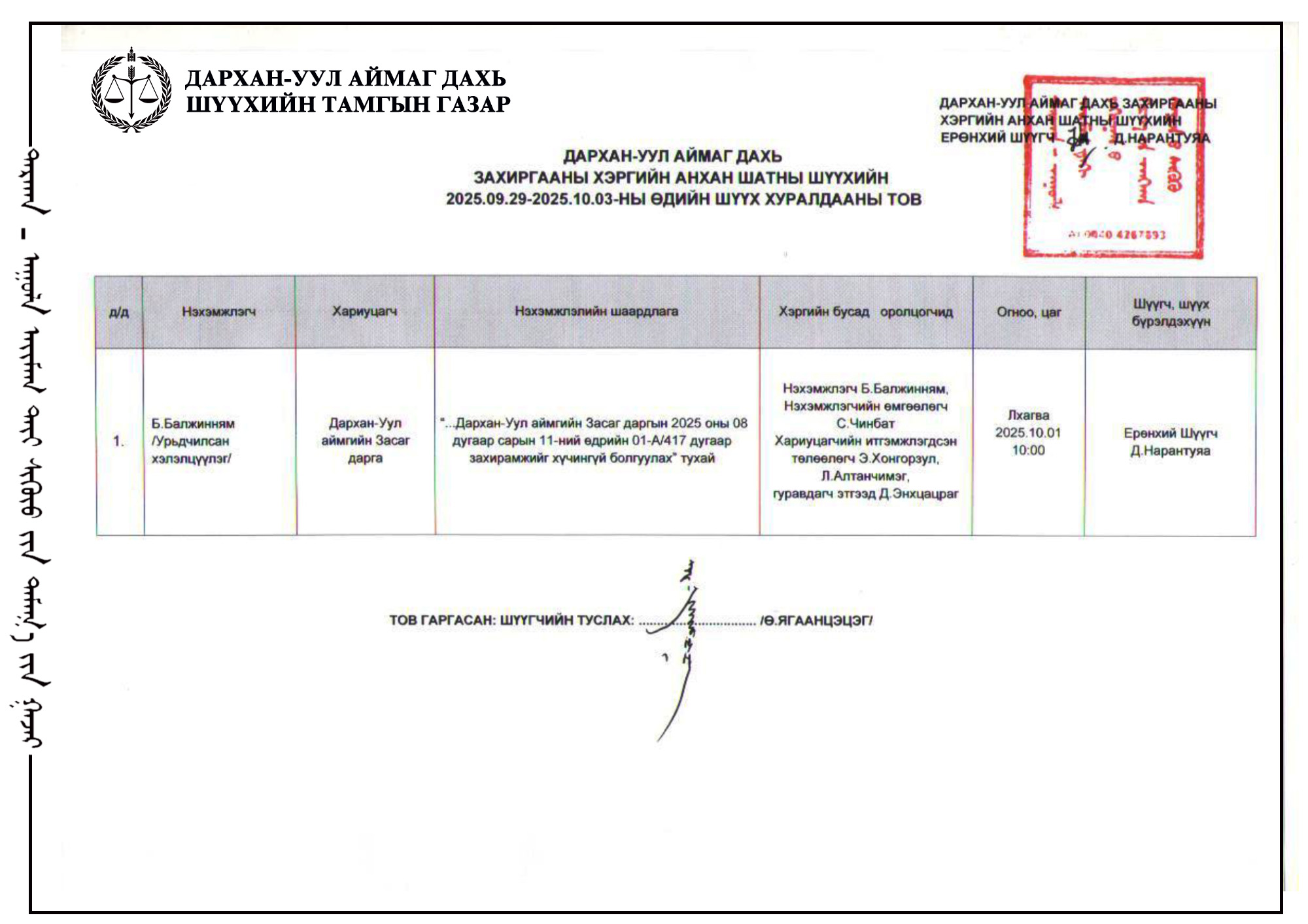 ШҮҮХ ХУРАЛДААНЫ ТОВ /Захиргааны хэргийн анхан шатны шүүх 2025.09.29-10.03/