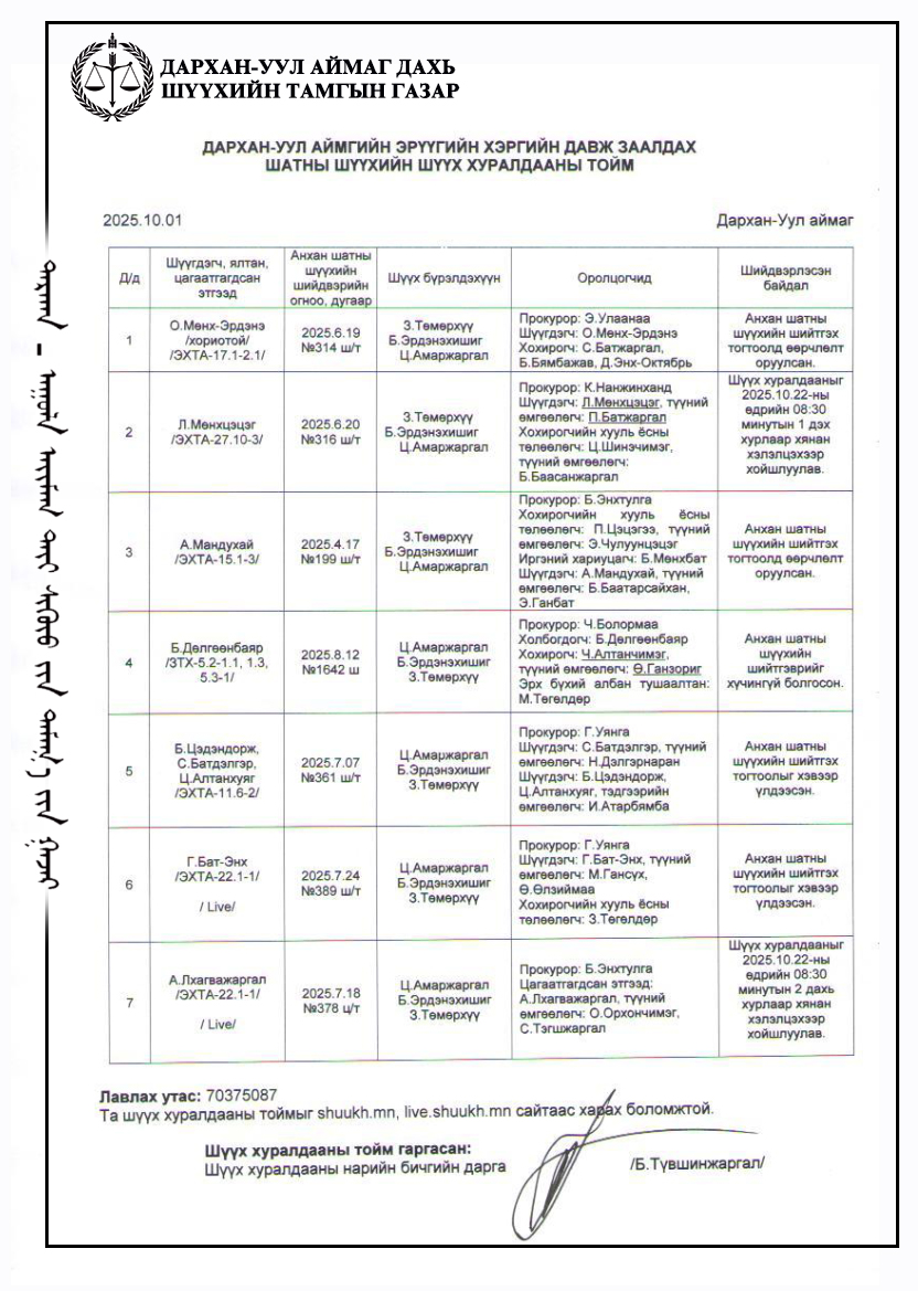 ШҮҮХ ХУРАЛДААНЫ ТОВ /Эрүүгийн хэргийн анхан шатны шүүх 2025.10.06-10.10/