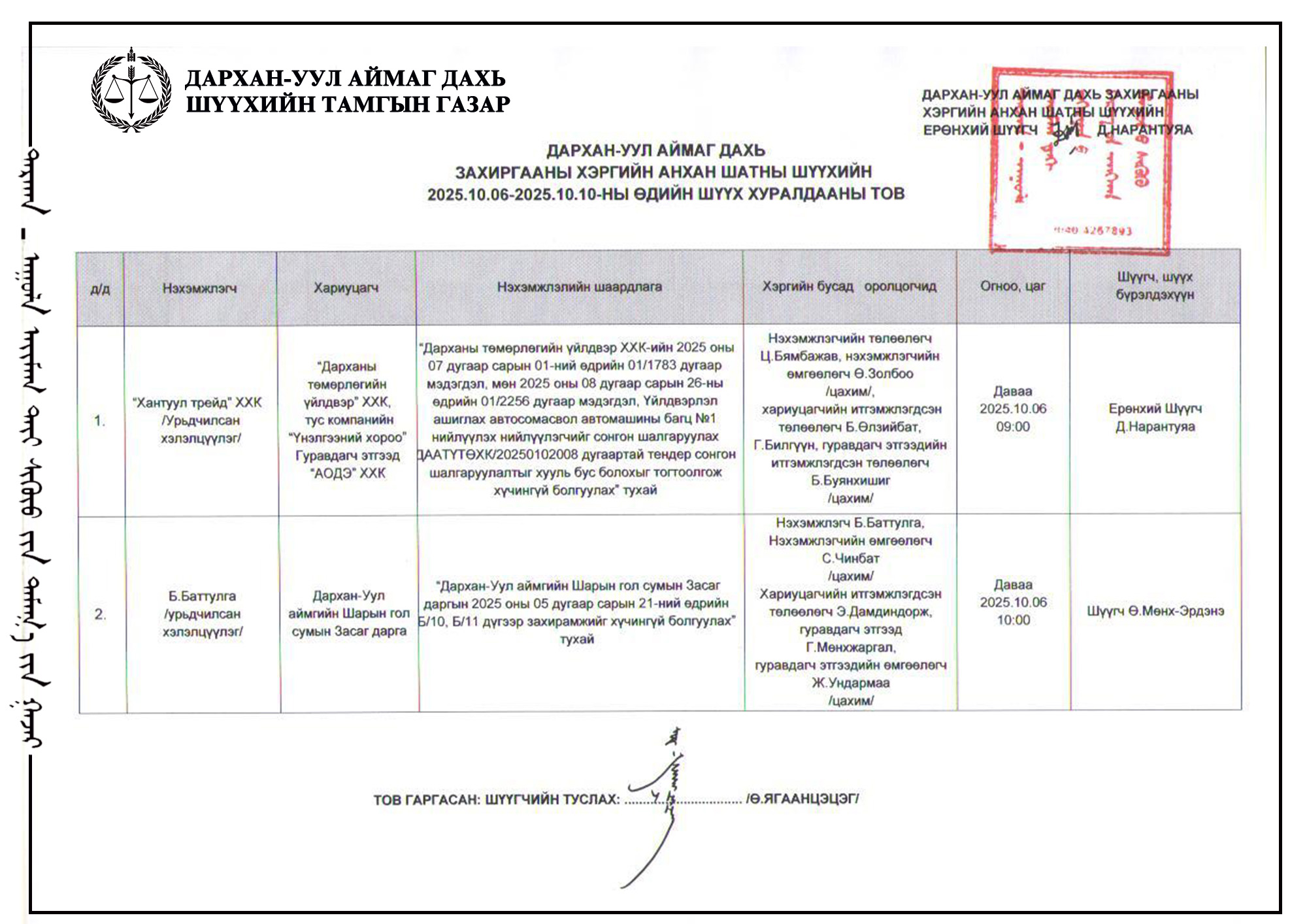 ШҮҮХ ХУРАЛДААНЫ ТОВ /Иргэний хэргийн анхан шатны шүүх 2025.10.06-10.10/