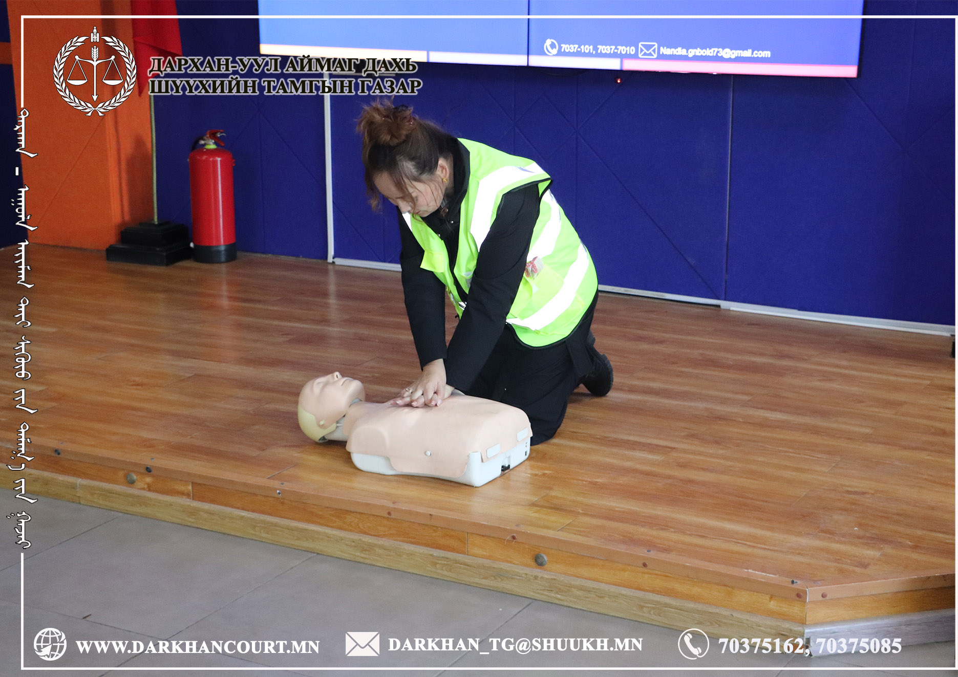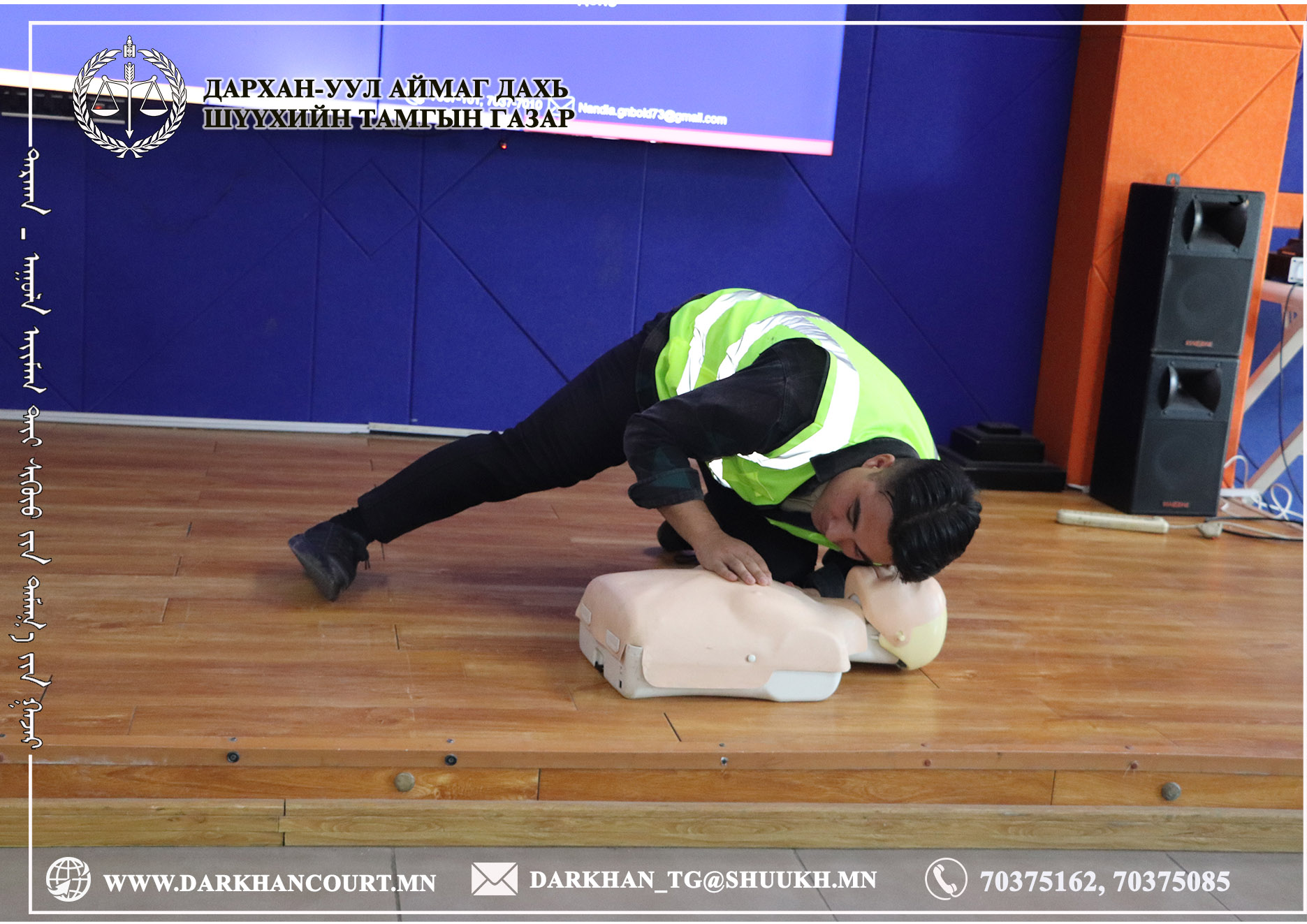 Тус сургалтын үеэр галд болон газар хөдлөлтөд нэрвэгдэгчид хэрхэн тусламж үзүүлэх арга, анхан шатны тусламж үзүүлэх үе шатууд, хиймэл амьсгал өгөх, галд түлэгдсэн, гар хөл нь хугарсан хүнд боолт хийх талаар дадлага хийж гал унтраах тоног төхөөрөмж, хэрэгслүүдтэй танилцав.