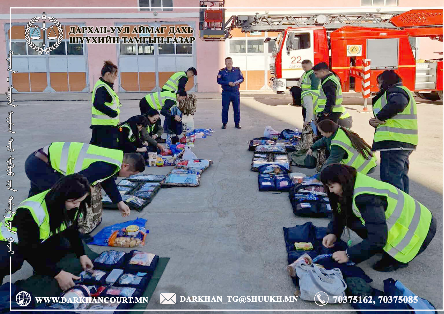 Мэргэжлийн ангийн гишүүд хүн нэг бүрийн үүргэвчинд байх байвал зохих зүйлийг бэлтгэн Гал унтраах ангийн захирагчид шалгуулан, иж бүрдлийг бүрэн хангах заавар зөвлөмж авч, үүргэвчид байгаа эд зүйлийг хэрхэн зөв ашиглах талаар мэдээлэл авч сонирхсон асуултууддаа хариулт авлаа.