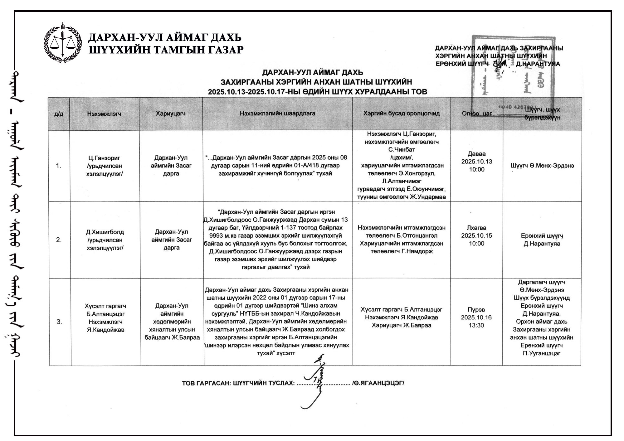 ШҮҮХ ХУРАЛДААНЫ ТОВ /Захиргааны хэргийн анхан шатны шүүх 2025.10.13-10.17/