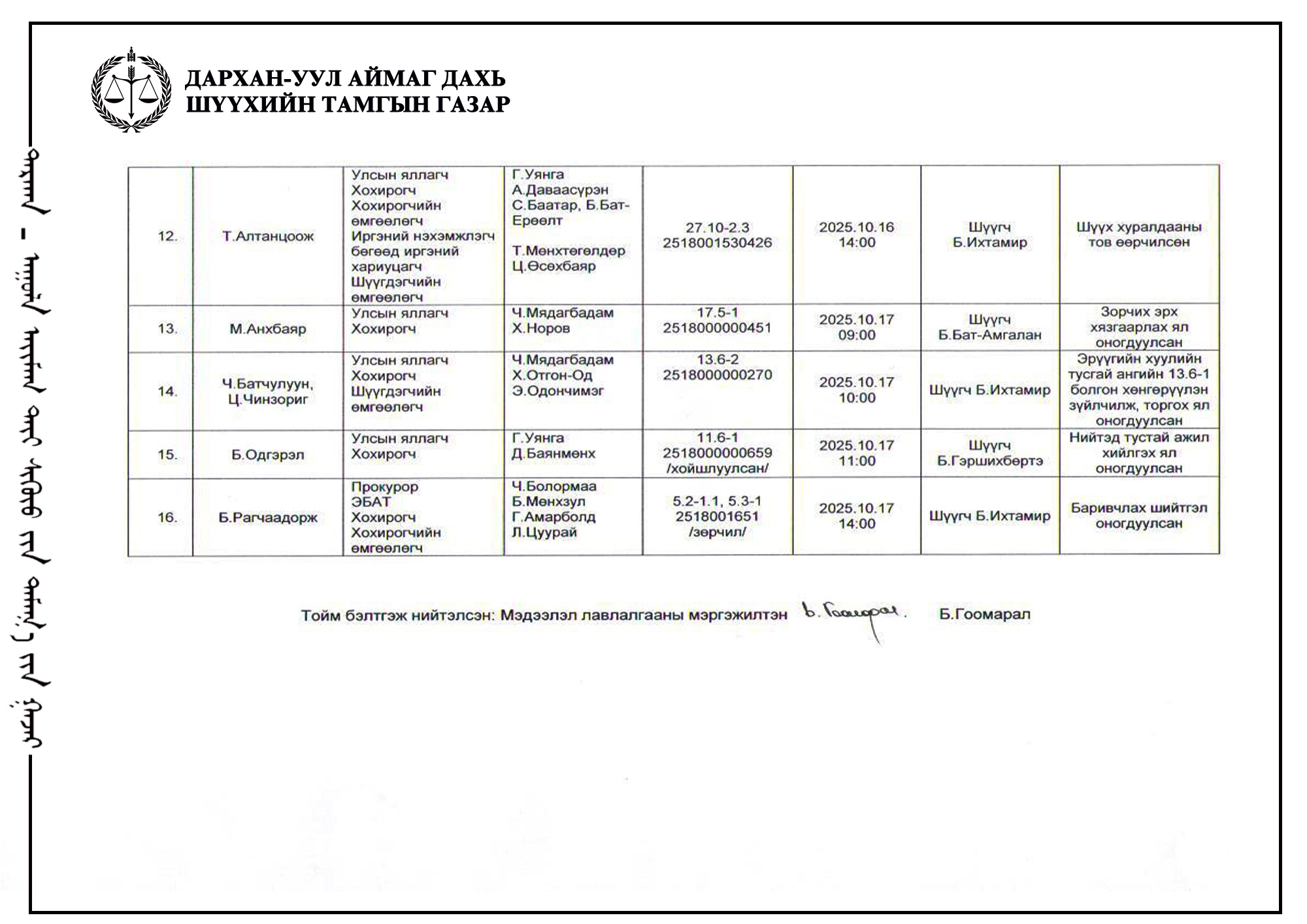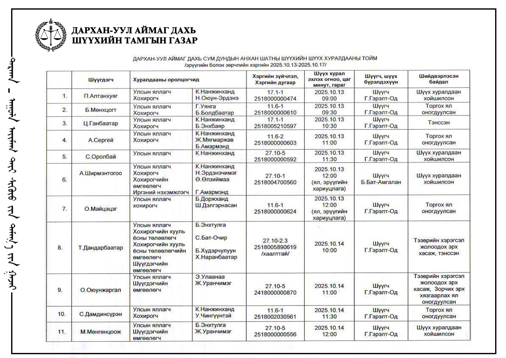 ШҮҮХ ХУРАЛДААНЫ ТОЙМ /Эрүүгийн хэргийн анхан шатны шүүх 2025.10.13-10.17/