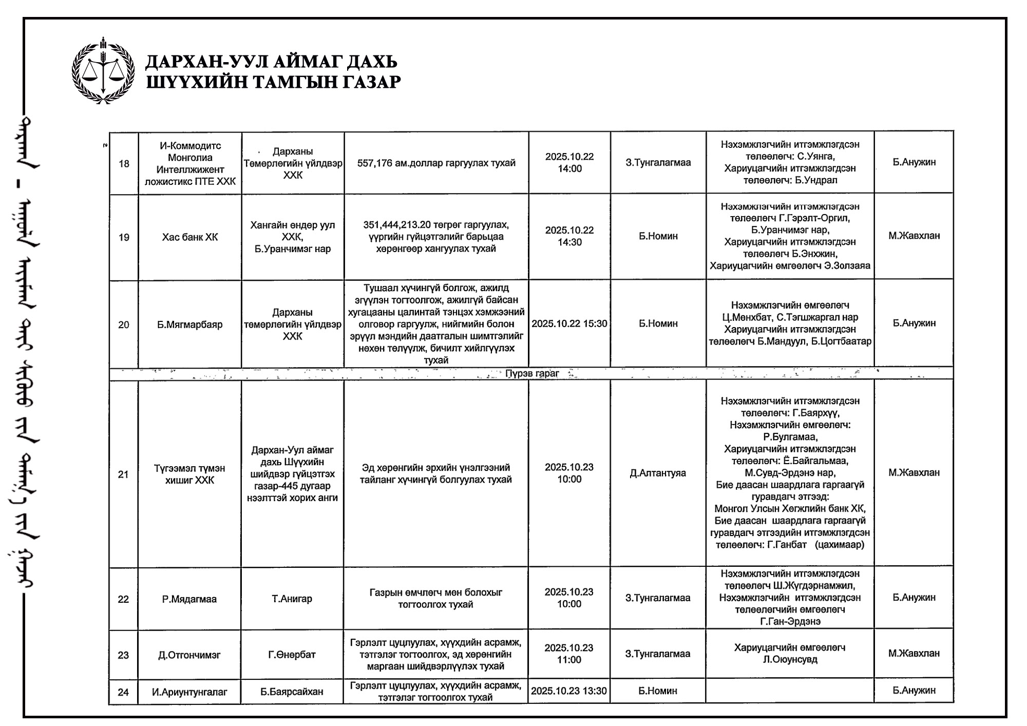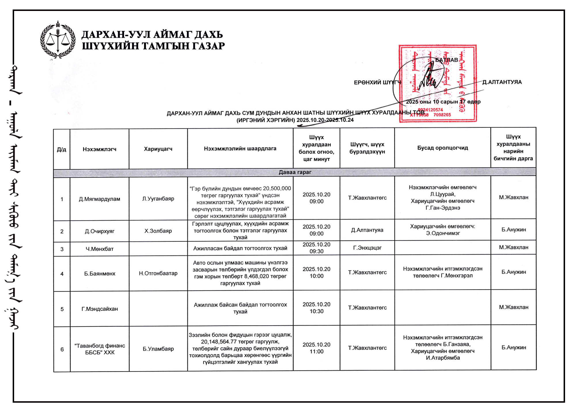 ШҮҮХ ХУРАЛДААНЫ ТОВ /Иргэний хэргийн анхан шатны шүүх 2025.10.20-10.24/