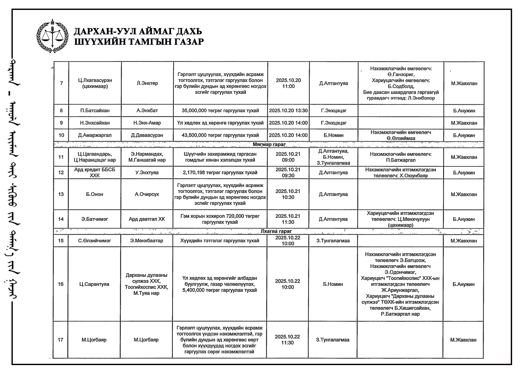 ШҮҮХ ХУРАЛДААНЫ ТОВ /Захиргааны хэргийн анхан шатны шүүх 2025.10.13-10.17/