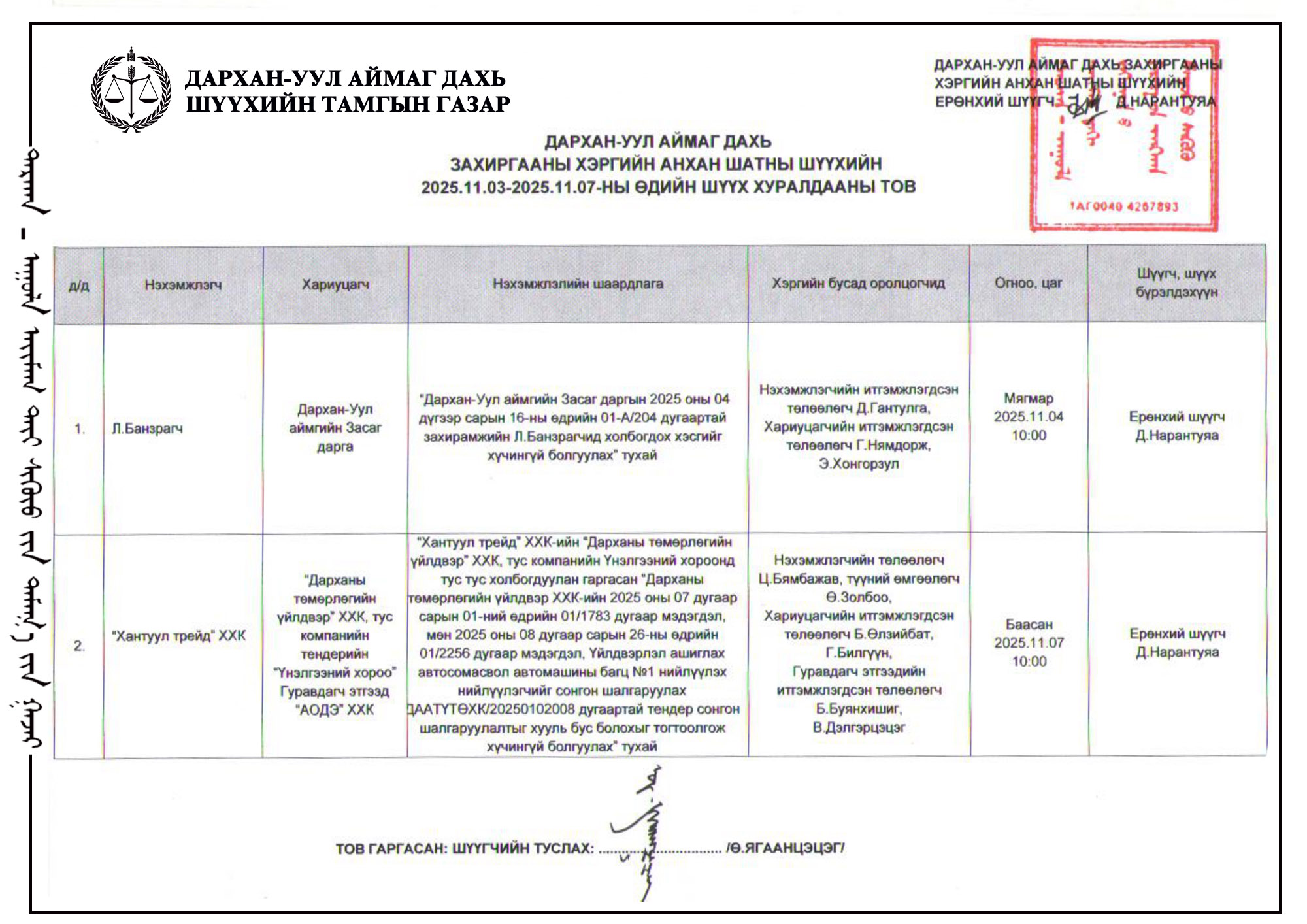 ШҮҮХ ХУРАЛДААНЫ ТОВ /Захиргааны хэргийн анхан шатны шүүх 2025.11.03-07/