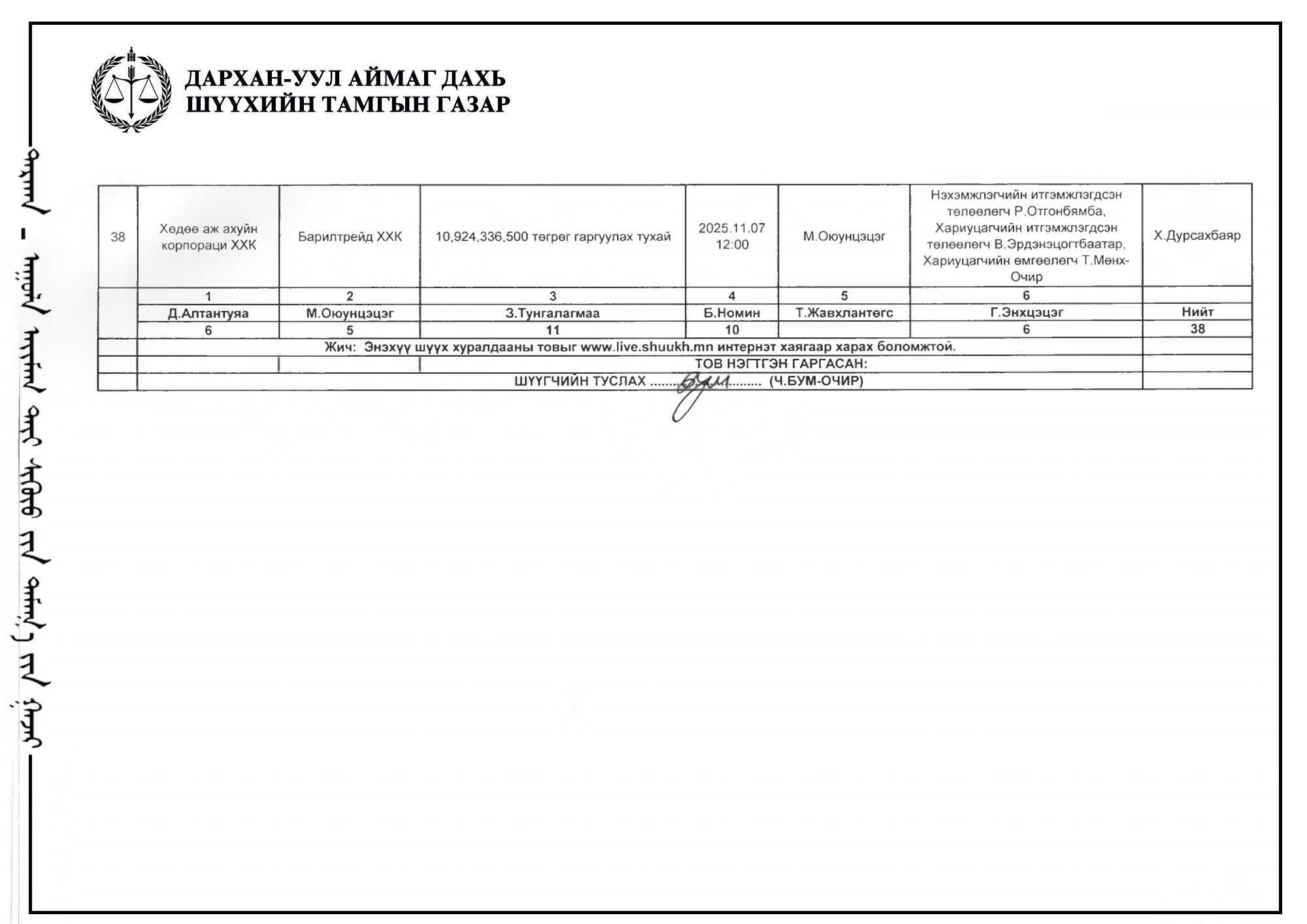 ШҮҮХ ХУРАЛДААНЫ ТОВ /Иргэний хэргийн анхан шатны шүүх 2025.11.03-11.07/