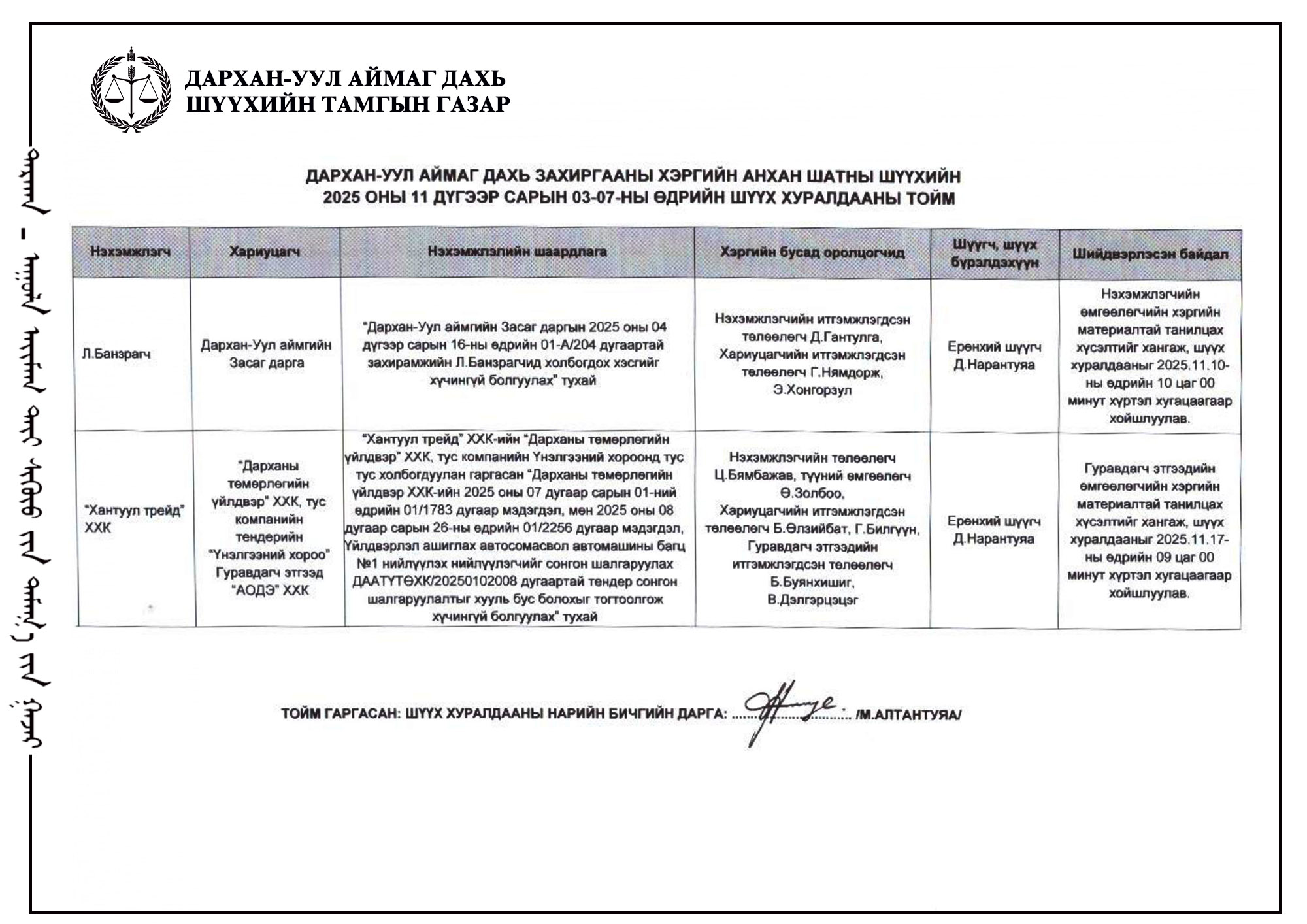 ШҮҮХ ХУРАЛДААНЫ ТОВ /Иргэний хэргийн анхан шатны шүүх 2025.11.10-11.14/