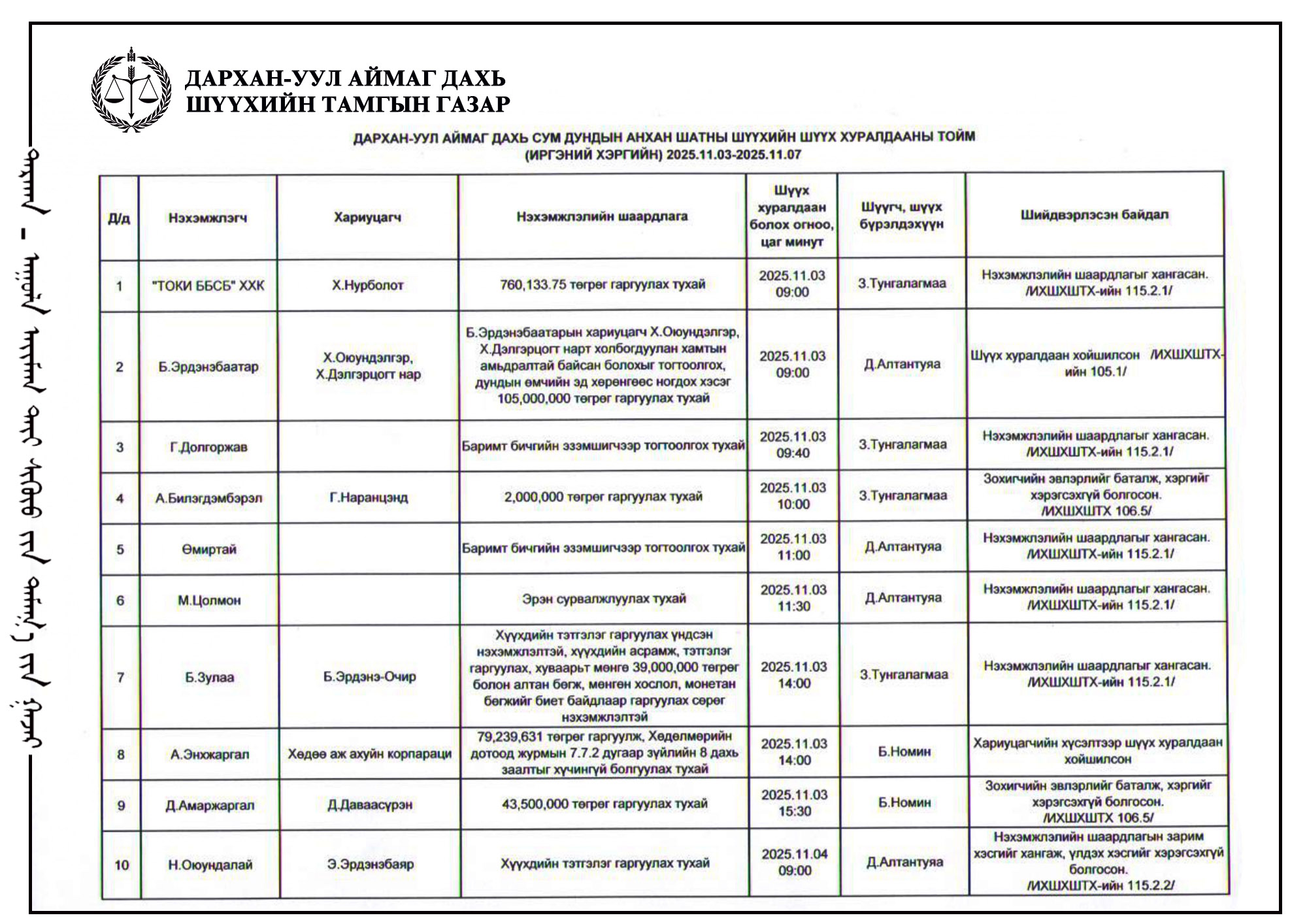 ШҮҮХ ХУРАЛДААНЫ ТОВ /Иргэний хэргийн анхан шатны шүүх 2025.11.10-11.14/