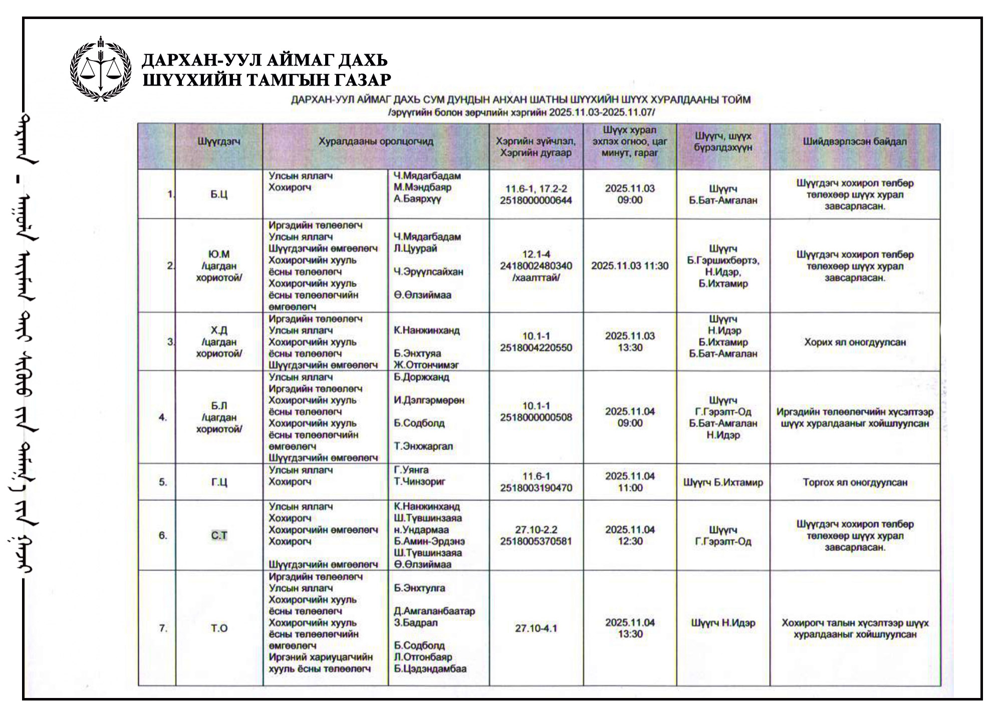 ШҮҮХ ХУРАЛДААНЫ ТОЙМ /Эрүүгийн хэргийн анхан шатны шүүх 2025.11.03-11.07/