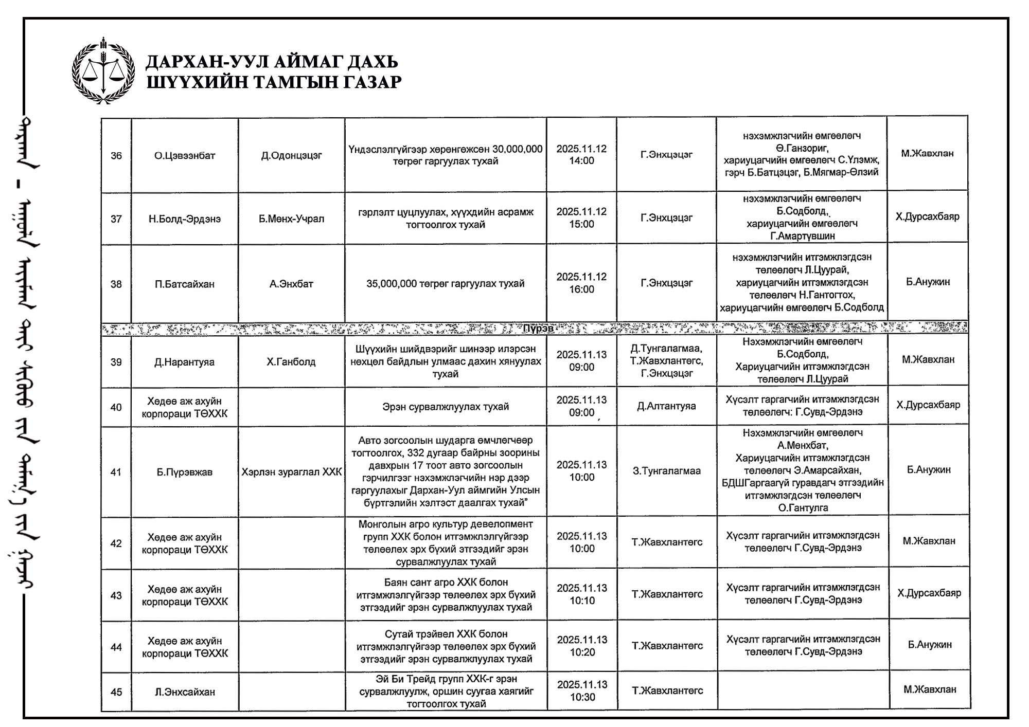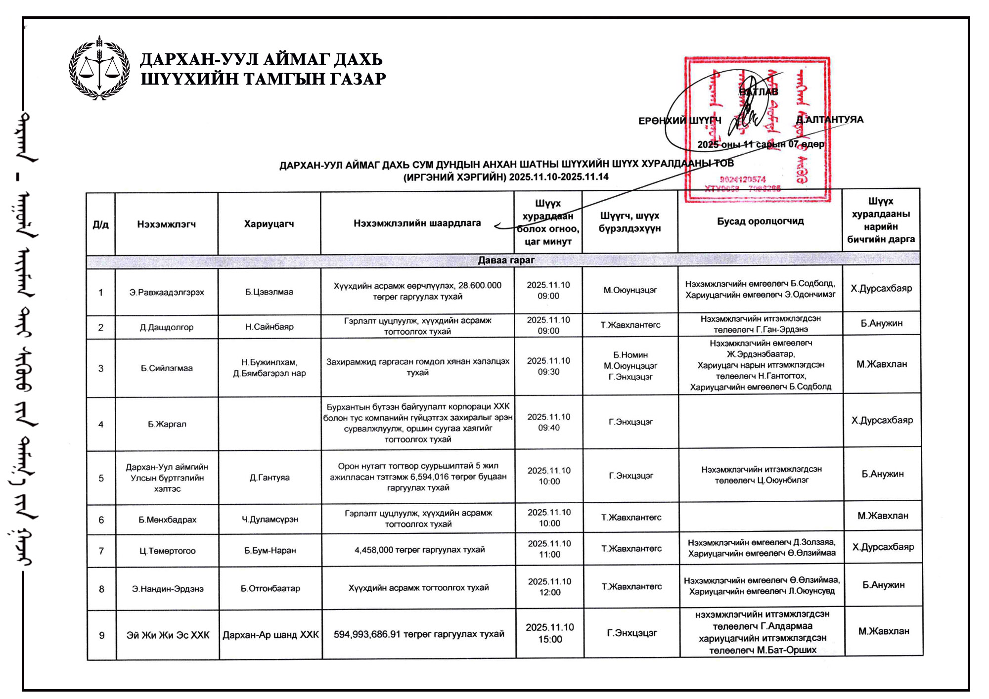 ШҮҮХ ХУРАЛДААНЫ ТОВ /Иргэний хэргийн анхан шатны шүүх 2025.11.10-11.14/